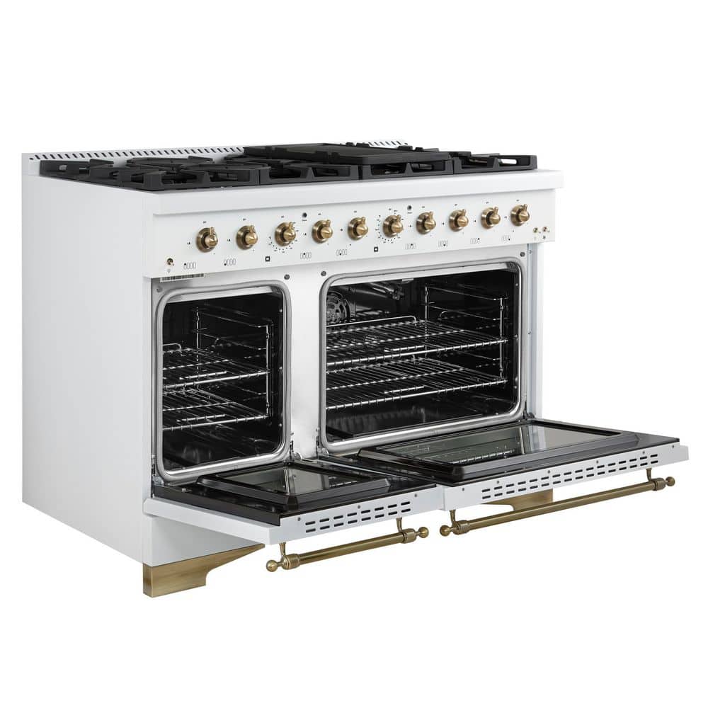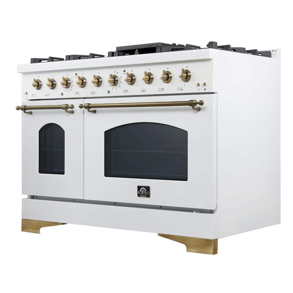 Upgrade your kitchen with the Forno Antico 48 in. Gas Range in white. Boasting 8-sealed burners with a total output of 94,000-BTU, it offers the power and precision needed for any culinary challenge. The 2-dual-ring brass burners provide up to 20,000-BTU for high-heat searing and 1,000-BTU for simmering, delivering exceptional control. Its 3.5 cu.ft. convection oven and an additional 2 cu.ft. oven offer ample capacity for large meals. The sleek white finish with antique brass accents exudes sophistication, while cast-iron grates ensure stability and durability. A recessed enamel cooktop makes cleanup effortless. Backed by Forno's 2-year warranty, this Gas Range is the perfect balance of power, design, and reliability. Forno, lower the cost of living.