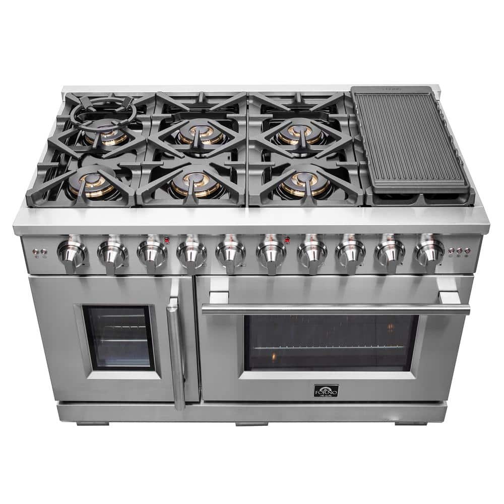 The 48 in. Forno Capriasca French Door Gas Range brings professional styling and quality into your home kitchen with its durable stainless-steel design. Unique French doors take up to to 12 in. of less open door space and easily open simultaneously with one hand. Cooktop has 8 sealed dual brass burners with a total stove top output of 160,000 BTU. This unit is ready to handle all your pots and pans with ease over its continuous heavy-duty cast-iron grate design. The 6.58 cu.ft. combined oven capacity boasts a total output of 44,000 BTU, providing plenty of power for baking, roasting, and broiling. Impressive blue enameled interiors allowing for easy cleaning and 3-layer glass oven door windows provide both heat retention and unobstructed view. Right-side oven has a true convection fan function. Included are 6 telescopic oven racks, reversible griddle, complete Rotisserie Kit including Skewer & Forks, concave Wok Ring, Air Fryer rack, drip pan and LP conversion kit. Housed in a high-grade 430 stainless steel body and illuminated zinc knobs, this unit sports a stylish look that is built to last. All Forno products are backed by an iron clad 2-year warranty for your satisfaction. Skip the high price tags without sacrificing quality and performance. Lower the cost of living with Forno.