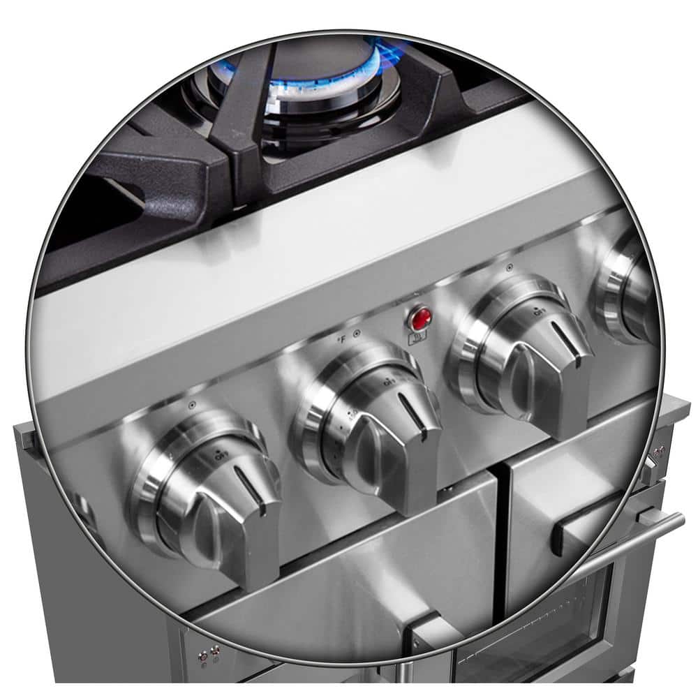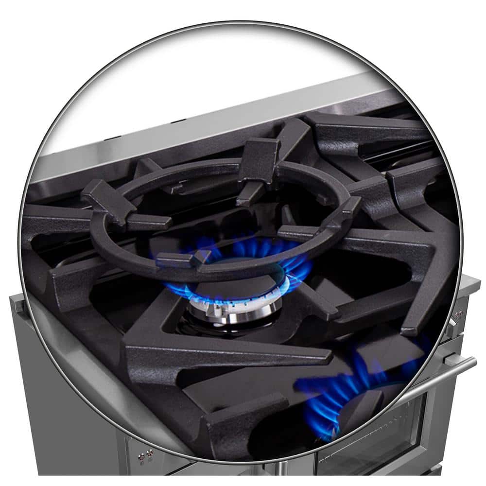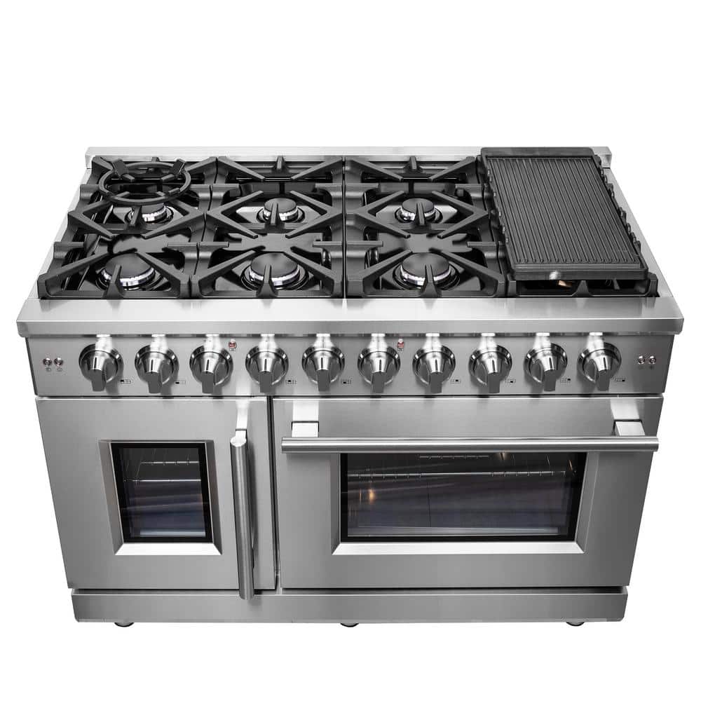 The Forno 48 in. Massimo French Door Gas Range brings professional styling and quality into your home kitchen with its durable stainless-steel design. Unique left swing oven door takes up to 12 in. of less open door space and easy access with one hand. Cooktop has 8 sealed burners with a total stove top output of 107,000 BTU including 1 sealed dual-ring brass burner for simmering delicate tasks like melting chocolate or cooking sauces, giving you the ability to cook up whatever delicious meals you desire. The heavy-duty continuous cast iron grates allow for even heat distribution and maximum stability of cookware mobility over a recessed enamel cooktop cavity which keeps spills and splashes contained and easy to clean. Double gas ovens have a combined 6.58 cu. ft. capacity with a total broil and bake output of 44,000 BTU, encased in blue enamel interiors with insulated oven doors and tempered 3-layer glass oven door windows. Right oven convection fan, thermostat and regulator ensures to achieve fast, precision and consistent oven cooking. Included are 4 telescopic oven racks, concave Wok Ring, reversible grill/griddle, Air Fryer basket, rack & drip pan, LP conversion kit and 3-prong power cord. Housed in a high-grade stainless steel body and zinc coated metal knobs with bezels. All Forno products are backed by an iron clad 2-year warranty for your satisfaction. Skip the high price tags without sacrificing quality and performance. Lower the cost of living with Forno.