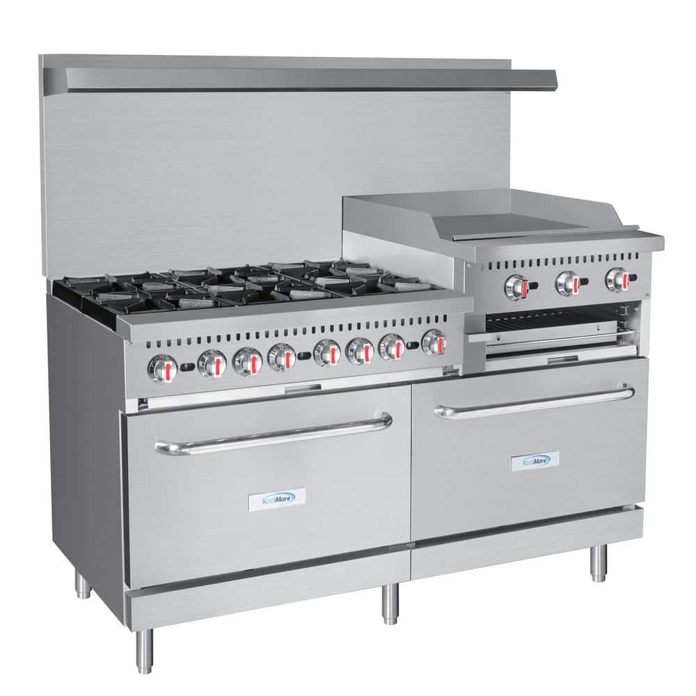 Crafting Unforgettable Meals Begins with a Natural Gas Range that Can Do It All!When it comes to commercial kitchen success it often comes down to the tools and appliances you're working with; especially when it comes to your range. That's why we created the KoolMore Gas Range and fitted it with all the extras needed to prep meals and recipes with exceptional precision. From our dual ovens to our griddle/broiler to our open-top burners it features all the amenities you'll need to do it with clean precision and exceptional style.Large Shelf and Backsplash, This big 60-inch also boasts a wide/tall backsplash to help keep your space cleaner and a shelf built-in above, so you can keep extra pots, pans, and supplies within easy reach.Support your busy kitchen, while super easy to manage with a single chef the larger size of our all-in-one unit means multiple cooks can support each other when they're making different meals or working to stay on top of different aspects of an entire recipe.Optional Caster Wheels, We now offer a compatible set of rolling caster wheels (KM-CR-CASTERS) for our unit to make it easier to slide away from the wall or move when it's time for deep cleaning, so you don't have to lift it.