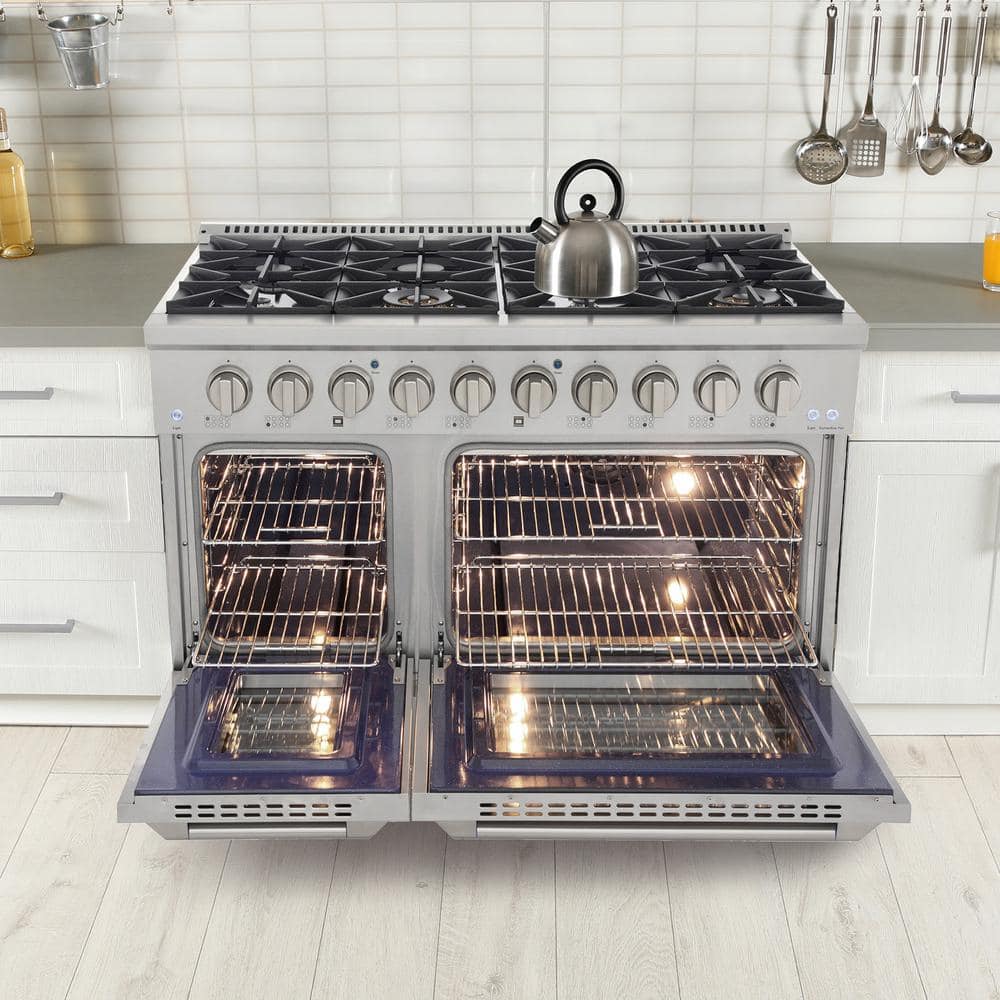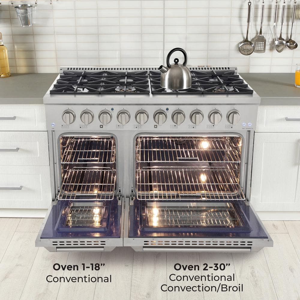 - Commercial-style 48 in. 6.7 cu. ft. double oven gas range