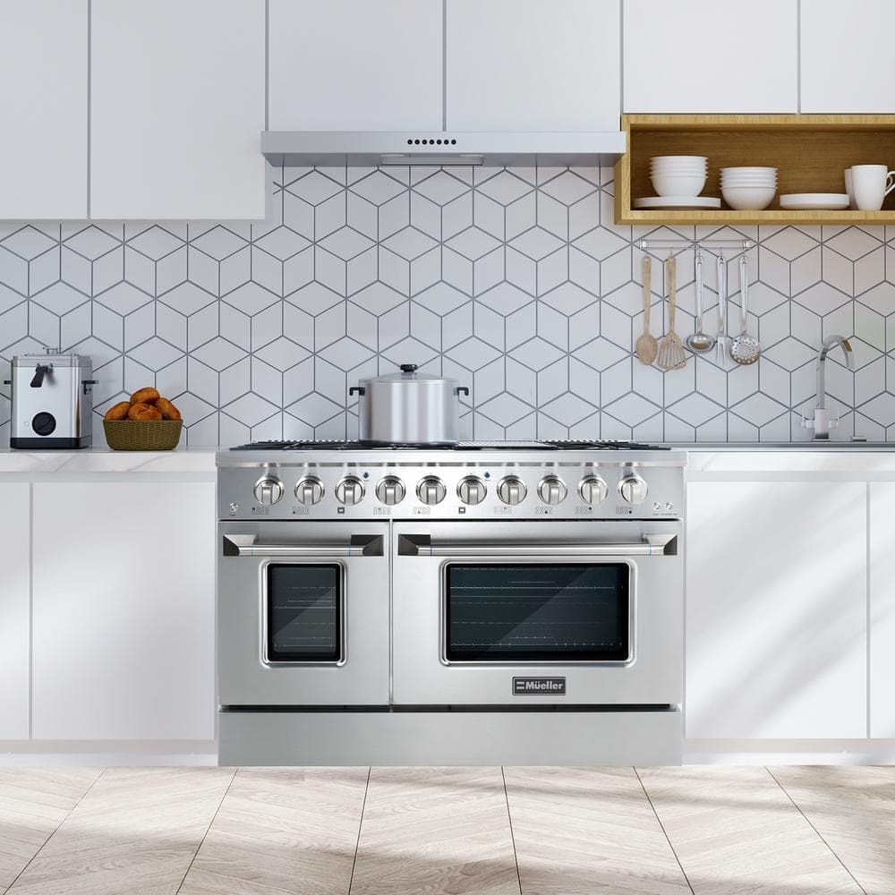 Take your cooking to the next level with the Mueller 48 in. Freestanding Range. The impressive size and power of the Professional Series Gas Range provides superior heating and precise control so you can enjoy the satisfaction of dishes cooked to perfection. Features 8 high-powered, Italian-made sealed gas burners for optimal performance. Includes two brass double burners with culinary power up to 20,000 BTU allowing you to cook at intense heat for boiling, frying, or searing, or gently simmer at 650 BTU for the most delicate sauces. The removable, heavy-duty griddle provides added versatility to your cooking repertoire with a ridged side for grilling and a flat side ideal for making morning pancakes. The Mueller Range also boasts dual ovens allowing you to simultaneously bake or broil while still using the cooktop. The dual ovens provide ample capacity at 6.7 cu. ft. The primary oven also features convenient convection functionality for even heat distribution to help deliver tenderness and crispness when required to your dishes. At Mueller, our team has designed and engineered this robust range with the end-user in mind, utilizing premium materials and finishing with a timeless appearance suitable for any kitchen design.