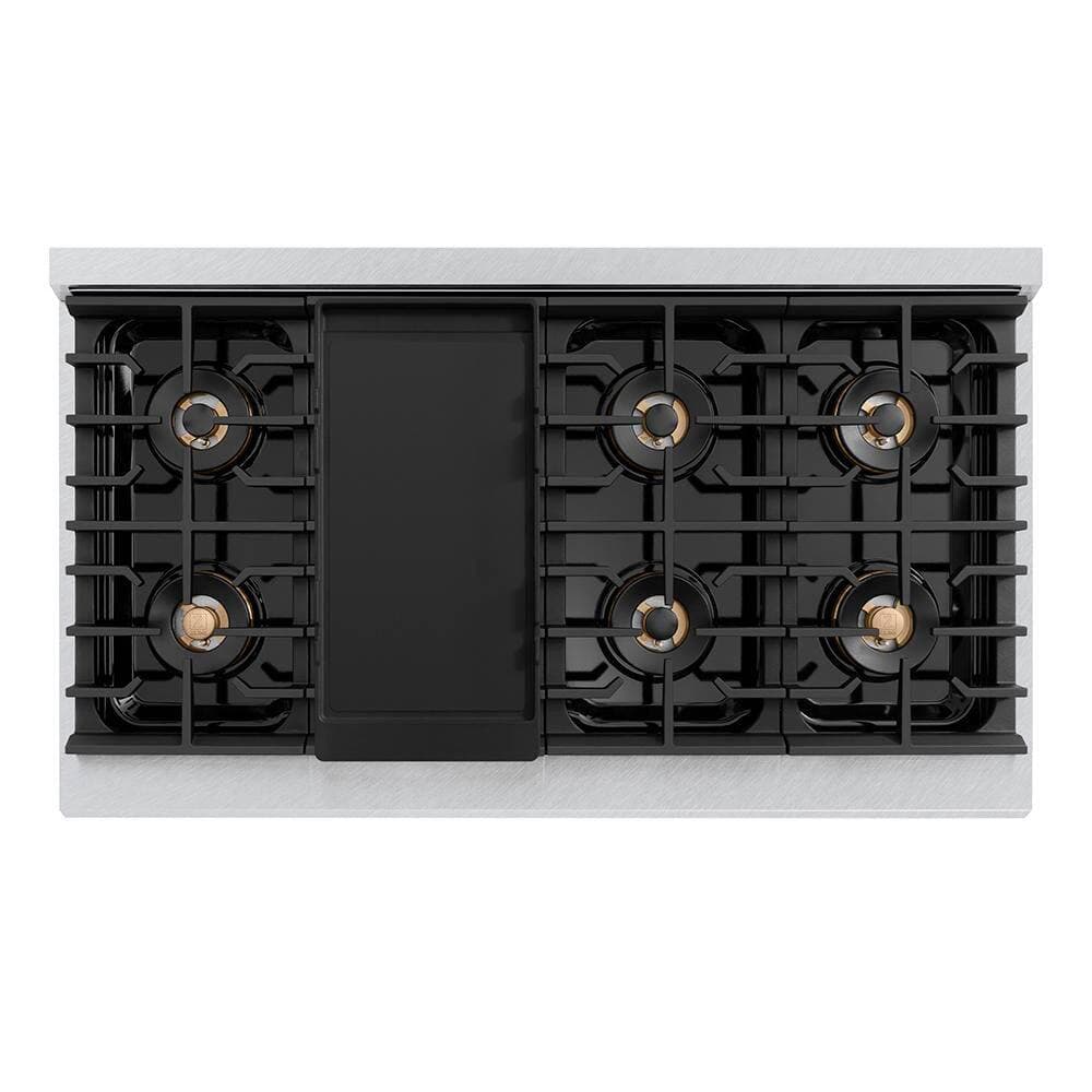ZLINE Kitchen and Bath Autograph 48 in. 6.7 cu. ft. Gas Range with 8-Burner Cooktop and Dual Ovens in Satin with White Matte and Champagne