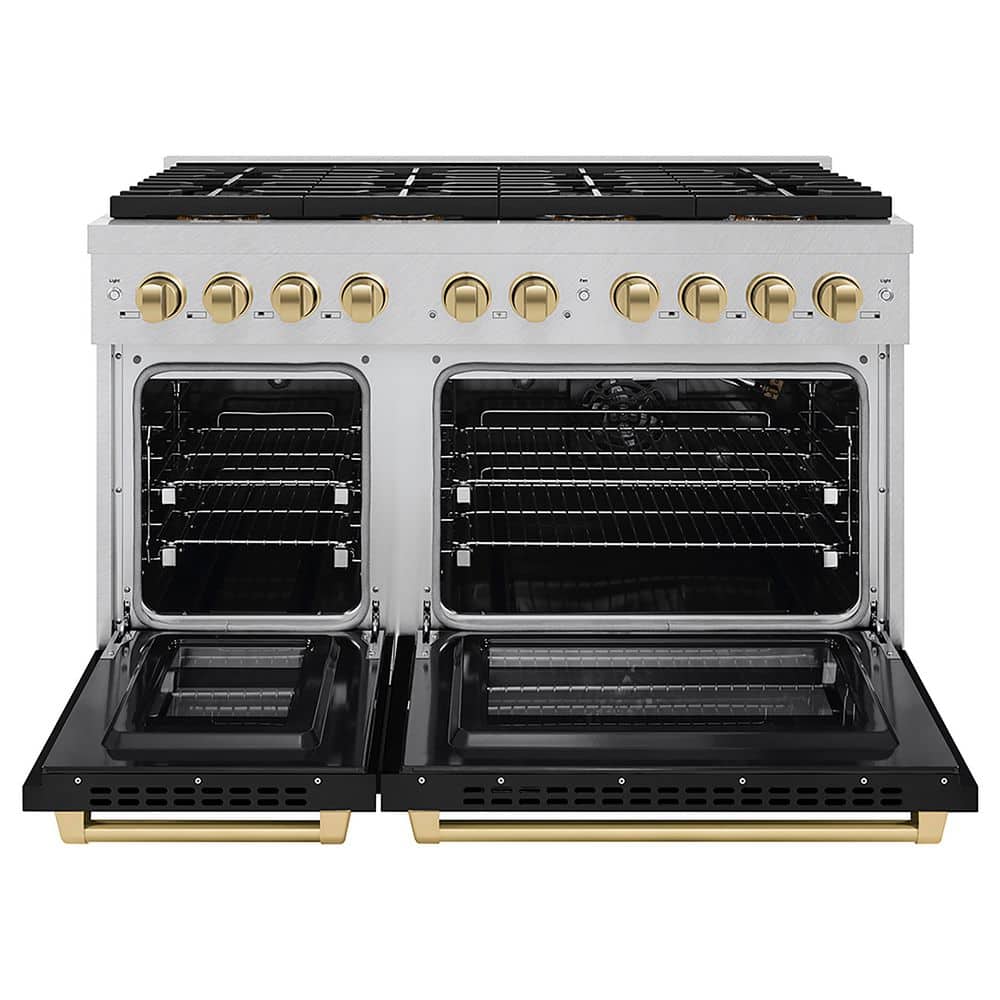 ZLINE Kitchen and Bath Autograph 48 in 6.7 cu. ft. Gas Range with 8-Burner DuoPro Cooktop and Dual Oven in Satin with Black Matte and Champagne