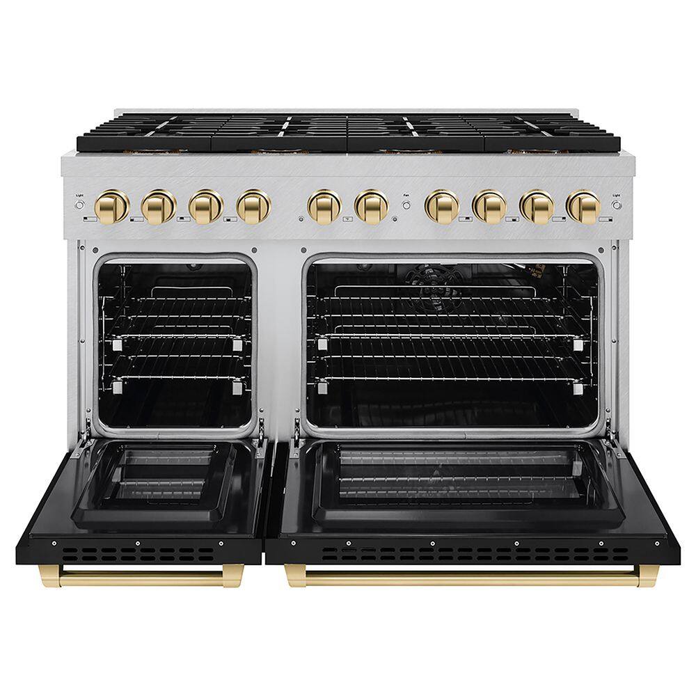 ZLINE Kitchen and Bath Autograph 48 in. 6.7 cu. ft. Gas Range with 8 Burner DuoPro Cooktop and Dual Ovens in Satin with Black Matte and Gold