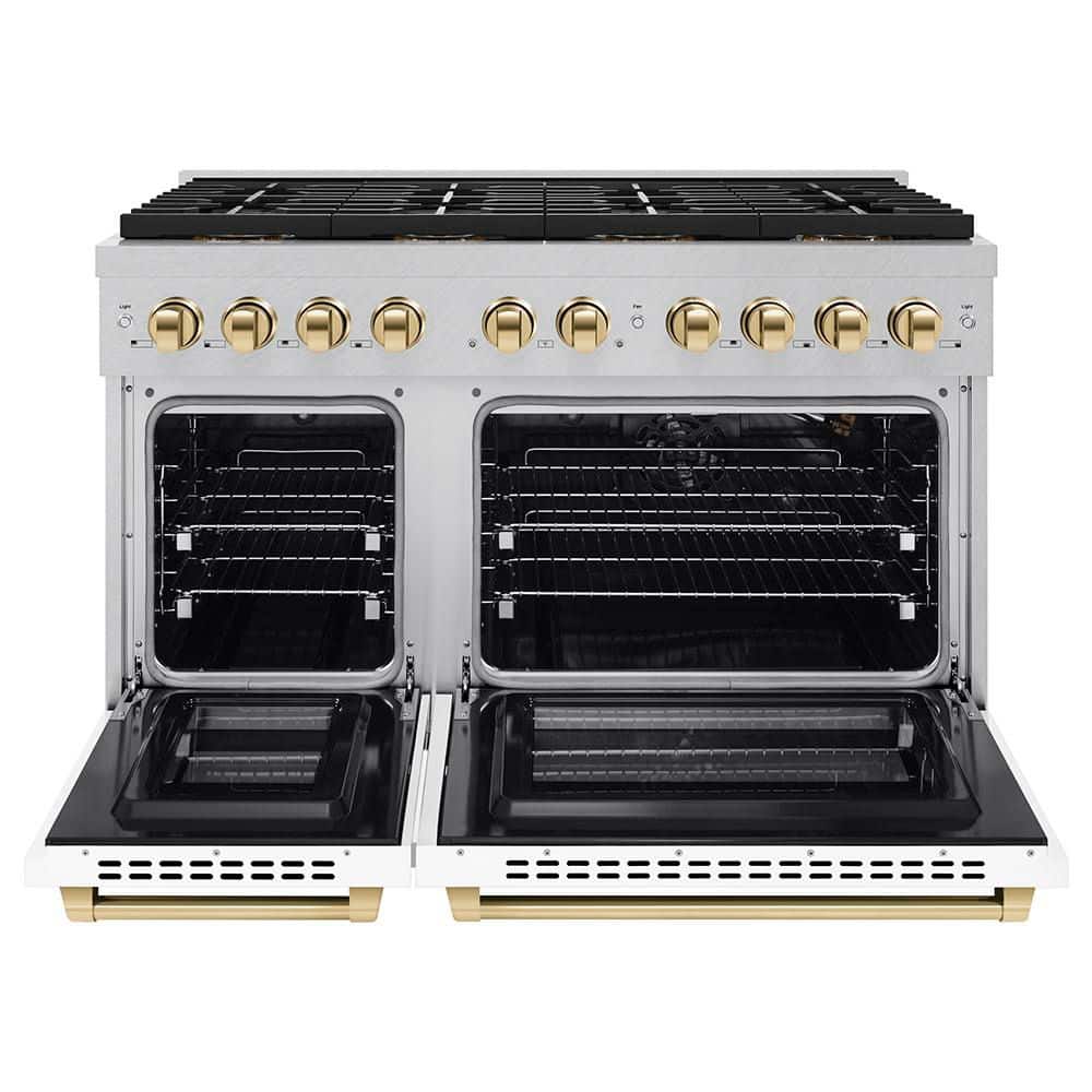 ZLINE Kitchen and Bath Autograph 48 in. 6.7 cu. ft. Gas Range with 8-Burner DuoPro Cooktop and Dual Ovens in Satin with White Matte and Gold
