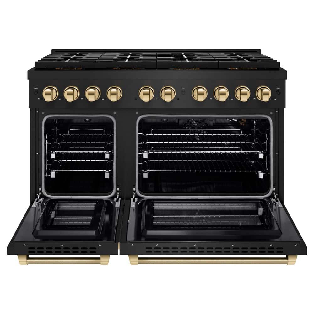 Luxury isn't meant to be left desired-it's meant to be attainable. The ZLINE Autograph Edition 48 in. 6.7 cu. ft. Paramount Gas Range with 8 Burner DuoPro Cooktop and Dual Ovens in Black Stainless Steel with Polished Gold Helix Handles and Accents (PSGRBZ-48-KG) features a high-powered gas cooktop with 8 hand-crafted Italian dual-ring brass burners and a versatile gas convection oven allowing you to master every meal. With ZLINE DuoPro, every burner brings the performance you need-wherever you need it.
