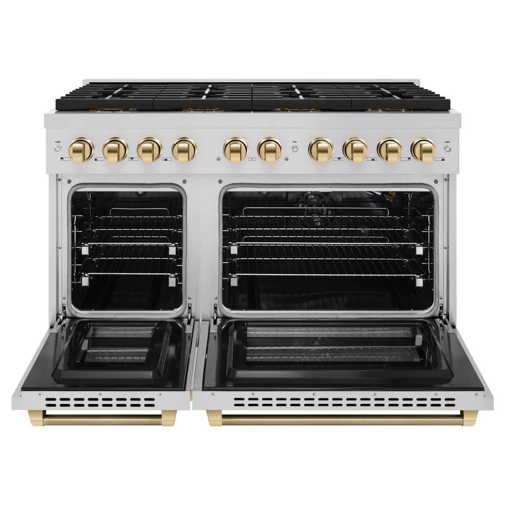 Luxury isn't meant to be left desired-it's meant to be attainable. The ZLINE Autograph Edition 48 in. 6.7 cu. ft. Paramount Gas Range with 8 Burner DuoPro Cooktop and Dual Ovens in Stainless Steel with Polished Gold Helix Handles and Accents (PSGRZ-48-KG) features a high-powered gas cooktop with 8 hand-crafted Italian dual-ring brass burners and a versatile gas convection oven allowing you to master every meal. With ZLINE DuoPro, every burner brings the performance you need-wherever you need it.