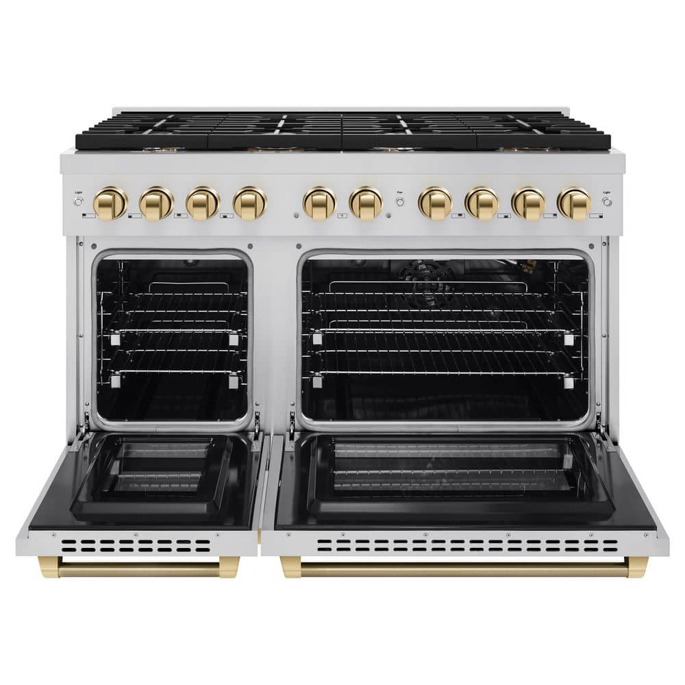Luxury isn't meant to be left desired-it's meant to be attainable. The ZLINE Autograph Edition 48 in. 6.7 cu. ft. Paramount Double Oven Gas Range with 8 Burner Cooktop in Stainless Steel and Polished Gold Helix Handles and Knob Accents (SGRZ-48-KG) features a versatile gas cooktop with 8 Italian-made auto-reignition burners, a large high-performing gas convection oven, a small baking oven, enhanced cast iron grates, and Horizon oven door window designs allowing you to master every meal. With a modern, timeless style and refined functionality, ZLINE Paramount Gas Ranges are masterfully crafted to deliver an elevated culinary experience.