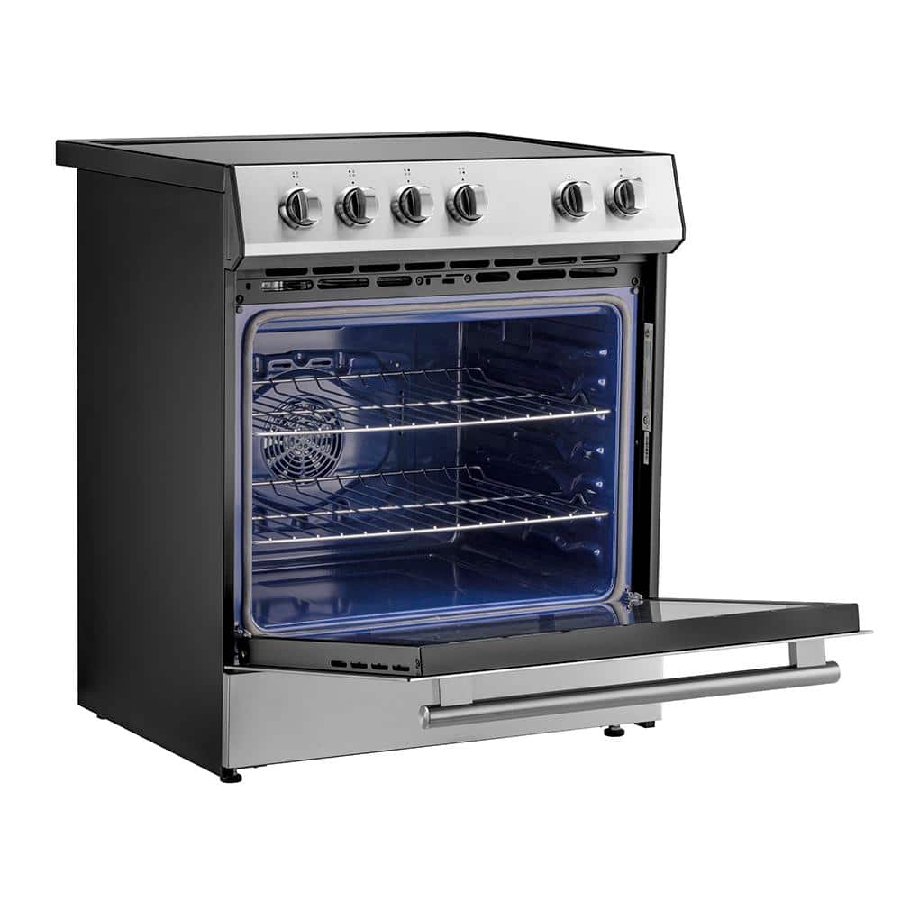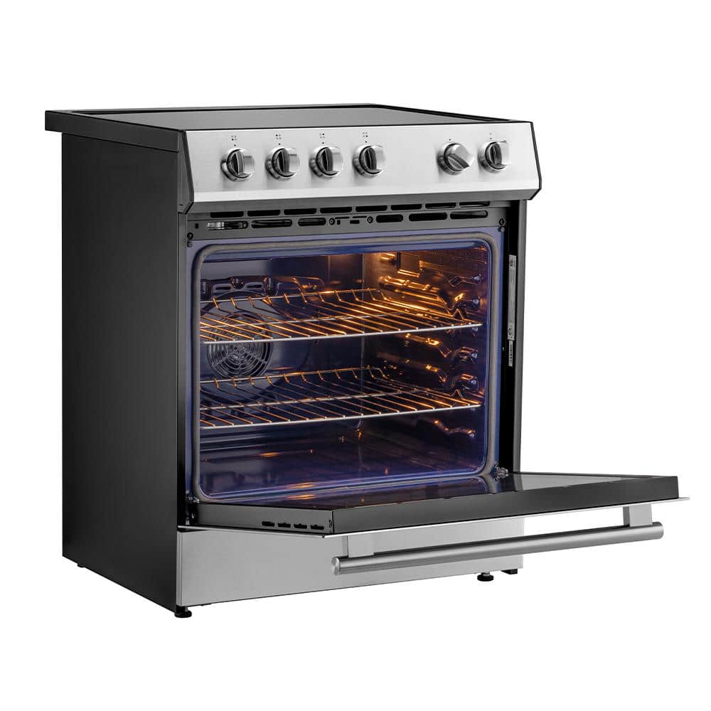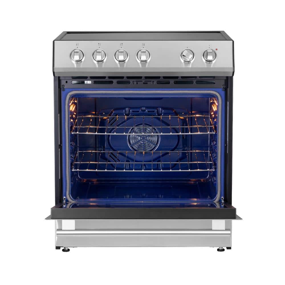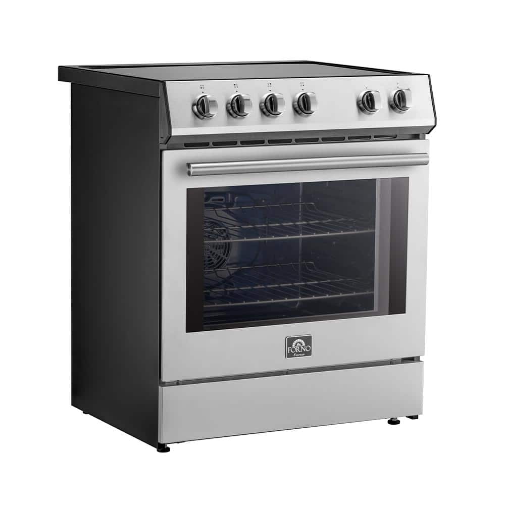 The Forno Leonardo Espresso 30 in. stainless steel induction range elevate your cooking experience with this perfect blend of style, functionality, and reliability. Combining customizable handles and knobs with powerful induction elements, that delivers a total power of 8,100 watts for efficient cooking. The ceramic glass cooktop guarantees precise heat distribution while facilitating effortless movement of cookware. The 5 cu. ft. convection oven boasts a high-performance convection fan and a broil and bake output of 3,500 watts. With 2-oven racks at your disposal, explore endless culinary possibilities with ease. The speckled blue enamel interior guarantees consistent heat absorption and retention, ensuring every dish is cooked to perfection. Effortless operation is ensured by friction-resistant hinges, while the hidden bake element prevents spills, simplifying maintenance. Skip the high price tags without sacrificing quality and performance. Lower the cost of living with Forno.