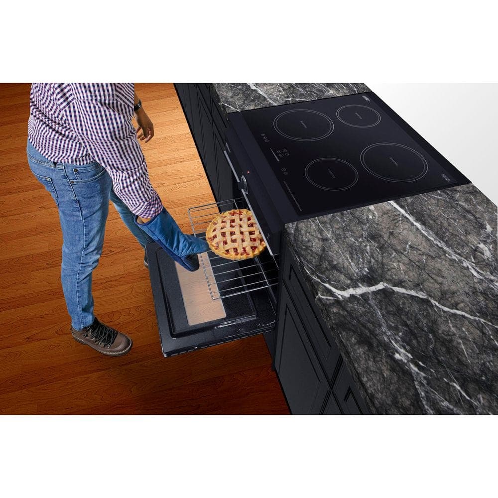 TEM665CW brings precise and efficient cooking to smaller kitchen spaces with a 24 in. footprint. The cooking surface features 4-induction zones, while the large electric oven offers nearly 3 cu. ft. of cooking space for baking and broiling. It has a recessed oven door and is conveniently sized at just 24 in. deep. This range requires professional installation. Unlike radiant heating, induction technology utilizes magnetized energy that starts inside the cookware; the temperature of the actual cooktop surface does not get as hot as traditional gas or electric elements. The surface is constructed from smooth EuroKera black glass. The front left and rear right elements are sized at 8 1/4 in. ideal for boiling large pots of water or cooking with woks and other large cookware. The digital display shows which elements are in use and their power setting. Audible beeps sound when the touch controls are activated. A timer function lets you program a power level and cook time that can either turn the unit off when complete, or serve as a visual countdown with an audible alert when the set time has been reached. Safety features include automatic shutdown, child lock, overheat protection, and overflow protection. This model's oven includes an interior light and window to keep your cooking in view. Two adjustable racks make it easy to accommodate a variety of sizes. The waist-high broiler inside the oven allows you to switch functions without moving contents to a separate compartment.