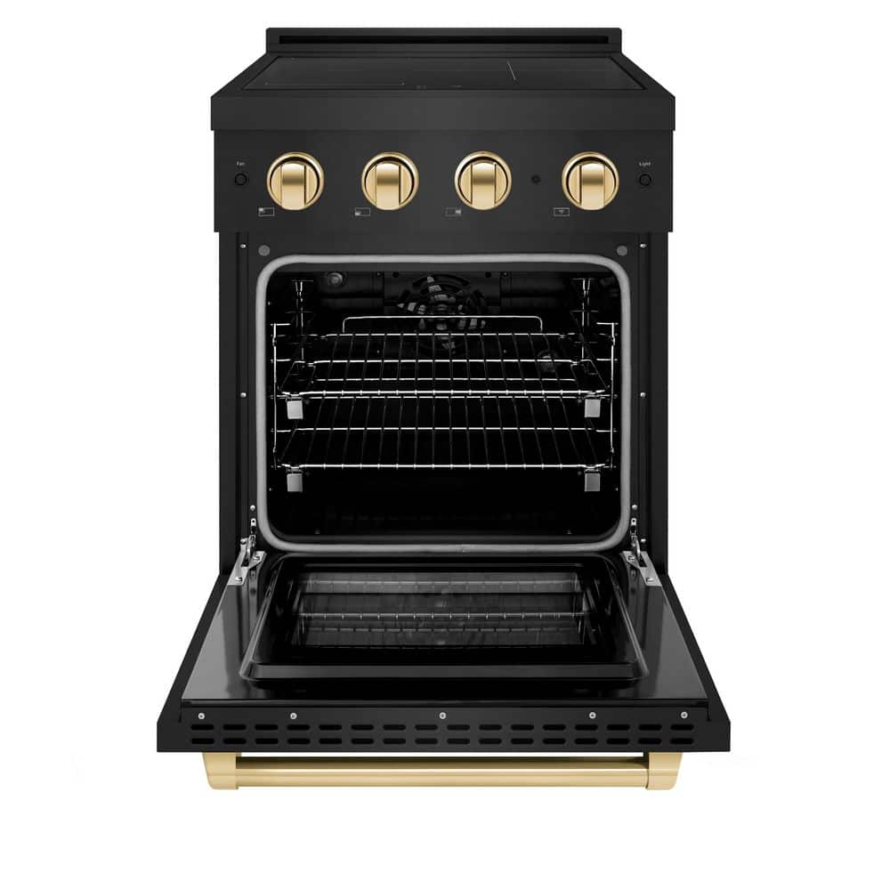 Luxury isn't meant to be left desired-it's meant to be attainable. The ZLINE Autograph Edition 24 in. 3.2 cu. ft. Paramount Induction Range with 3 Element Cooktop and Electric Convection Oven in Black Stainless Steel with Polished Gold Accents (SINRBZ-24-G) combines the versatility of a nanotechnology-reinforced anti-scratch cooktop with anti-glare coating, an electric convection oven with digital thermostat technology, and a Horizon oven door window design allowing you to master every meal. With a modern, timeless style and refined functionality, ZLINE Paramount Induction Ranges are masterfully crafted to deliver an elevated culinary experience.