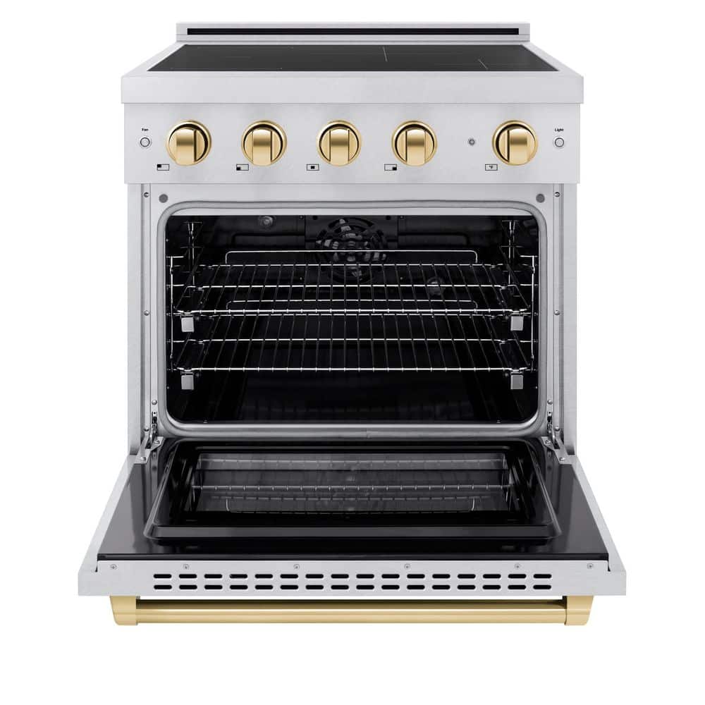 Luxury isn't meant to be left desired-it's meant to be attainable. The ZLINE Autograph Edition 30 in. 4.2 cu. ft. Paramount Induction Range with 4 Element Cooktop and Electric Convection Oven in Satin Stainless Steel with Polished Gold Accents (SINRSZ-30-G) combines the versatility of a nanotechnology-reinforced anti-scratch cooktop with anti-glare coating, an electric convection oven with digital thermostat technology, and a Horizon oven door window design allowing you to master every meal. With a modern, timeless style and refined functionality, ZLINE Paramount Induction Ranges are masterfully crafted to deliver an elevated culinary experience.