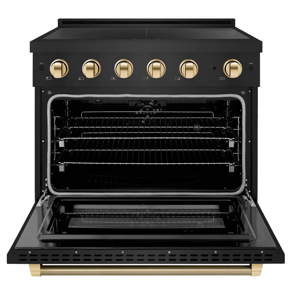Luxury isn’t meant to be left desired—it’s meant to be attainable. The ZLINE Autograph Edition 36 in. 5.2 cu. ft. Paramount Induction Range with 5 Element Cooktop and Electric Convection Oven in Black Stainless Steel with Polished Gold Helix Handle and Knob Accents (SINRBZ-36-KG) combines the versatility of a nanotechnology-reinforced anti-scratch cooktop with anti-glare coating, an electric convection oven with digital thermostat technology, and a Horizon oven door window design allowing you to master every meal. With a modern, timeless style and refined functionality, ZLINE Paramount Induction Ranges are masterfully crafted to deliver an elevated culinary experience.