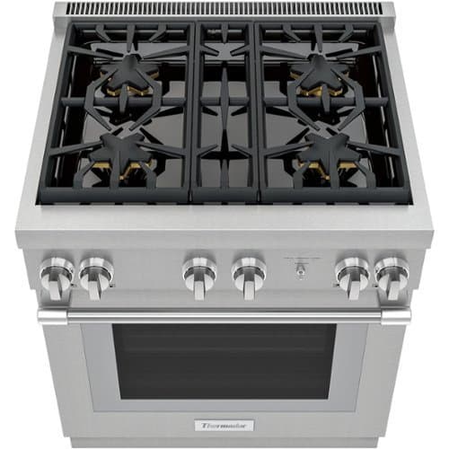 The 30-inch Thermador Pro Harmony standard-depth duel-fuel Range is Truly Flush Mounted with 4 Star Burners in a convenient 30-inch footprint. The range is equipped with 2 Extralow Simmer burners that provide precise simmering capabilities. The Patented Star Burner is 56% longer than a round burner of the same size, enabling a superior flame spread for even heating and features a QuickClean Base designed for easy cleaning. The range has a two-hour self-cleaning mode to reduce cleanup time.