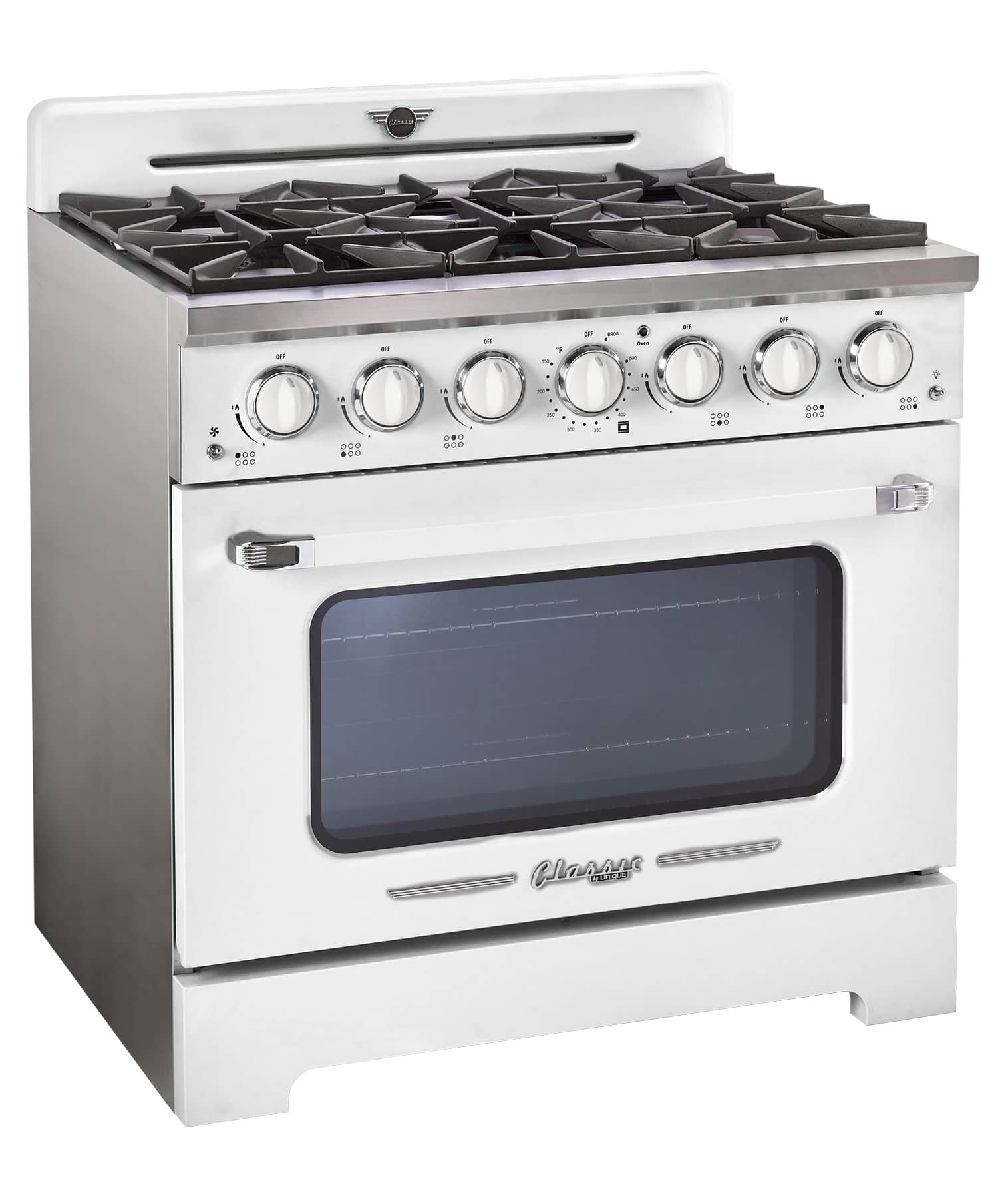 The 36 in. Classic Retro Gas Range transports you back to the 50s with its iconic retro design and chrome finished accents. It has a 6-burner gas cooktop with high quality sealed Italian-made burners capable of an intense sear or delicate sauce simmering. This range also allows for convection cooking circulating heat for incredibly even distribution, while the waist-high broiler provides the option of intense searing. With 2 backsplashes to choose from, you can have the exact look you want for your kitchen. Pair with one of Unique Appliances matching Classic Retro Fridges or Range Hoods for a stunning set.