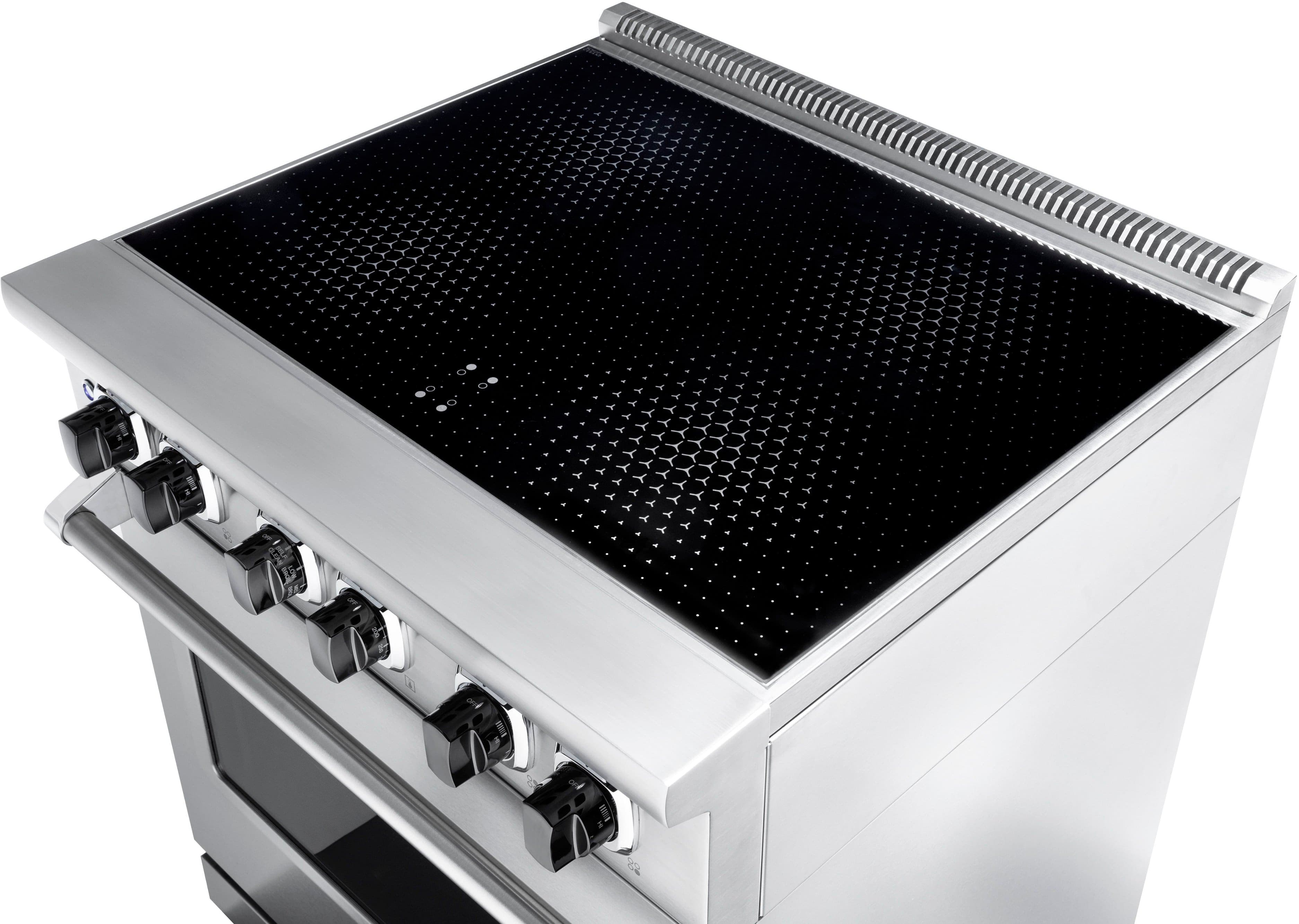 The Viking 5-Series induction self-cleaning range touts one of the largest oven cavities in the industry with 9 different cooking modes and 6 oven rack positions. The ceramic glass cooktop surface is both durable and easy to keep clean as induction keeps the cooking surface substantially cooler than a traditional all electric smoothtop.