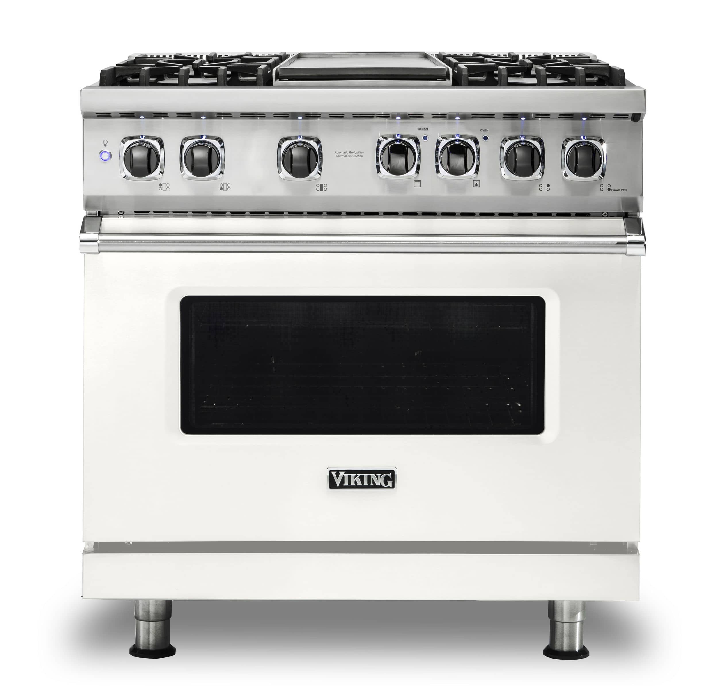 Cook for family and friends with this 36-inch Viking dual fuel range. It offers four sealed burners plus a built-in griddle for easy stove-top frying, and its VariSimmer setting controls low heat for delicate sauces. This Viking dual fuel range includes a 5.6 cu. ft. oven with the Rapid Ready system for fast preheating.