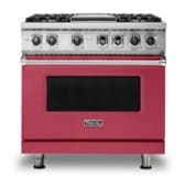 Cook for family and friends with this 36-inch Viking dual fuel range. It offers four sealed burners plus a built-in griddle for easy stove-top frying, and its VariSimmer setting controls low heat for delicate sauces. This Viking dual fuel range includes a 5.6 cu. ft. oven with the Rapid Ready system for fast preheating.