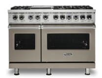 Make delicious meals with this 48-inch Viking Professional dual fuel range. Its six VariSimmer burners include one with 18,500 BTUs of power for recipes that require intense heat, and its 12-inch griddle is thermostatically controlled for even cooking. Bake desserts while roasting a main entree in the 7.3 cu. ft. double convection oven of this Viking Professional dual fuel range.