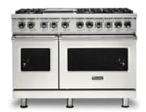 Make delicious meals with this 48-inch Viking Professional dual fuel range. Its six VariSimmer burners include one with 18,500 BTUs of power for recipes that require intense heat, and its 12-inch griddle is thermostatically controlled for even cooking. Bake desserts while roasting a main entree in the 7.3 cu. ft. double convection oven of this Viking Professional dual fuel range.