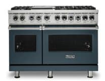 Make delicious meals with this 48-inch Viking Professional dual fuel range. Its six VariSimmer burners include one with 18,500 BTUs of power for recipes that require intense heat, and its 12-inch griddle is thermostatically controlled for even cooking. Bake desserts while roasting a main entree in the 7.3 cu. ft. double convection oven of this Viking Professional dual fuel range.