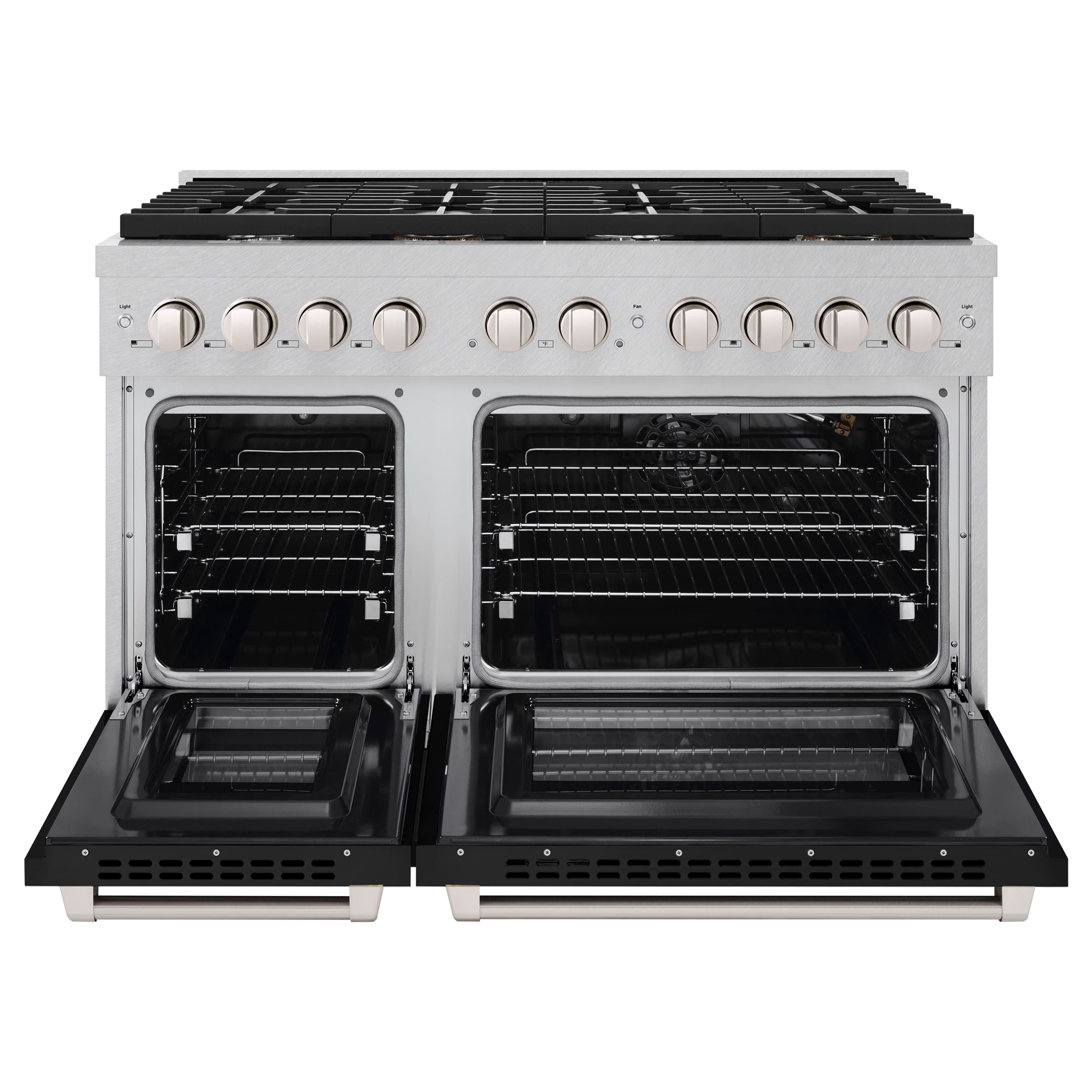 Luxury isn’t meant to be left desired — it’s meant to be attainable. The ZLINE 48 in. 6.7 cu. ft. Paramount Double Oven Gas Range with 8 Burner Cooktop in Satin Stainless Steel with Black Matte Doors (SGRS-BLM-48) features a versatile gas cooktop with 8 Italian-made auto-reignition burners, a large high-performing gas convection oven, a small baking oven, enhanced cast iron grates, and beautiful black matte doors with Horizon window designs allowing you to master every meal. With a modern, timeless style and refined functionality, ZLINE Paramount Gas Ranges are masterfully crafted to deliver an elevated culinary experience.