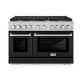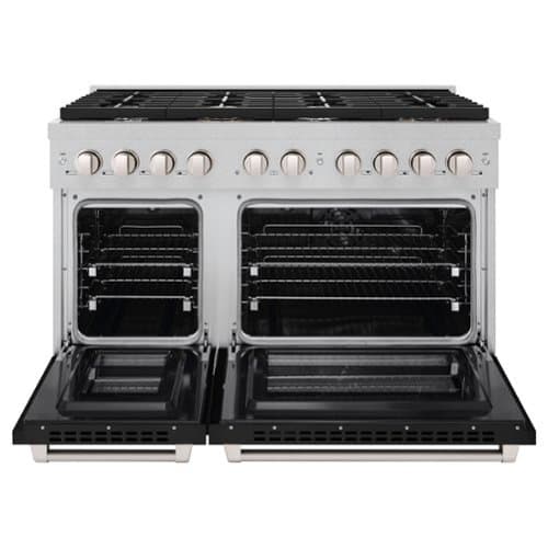 Luxury isn’t meant to be left desired — it’s meant to be attainable. The ZLINE 48 in. 6.7 cu. ft. Paramount Double Oven Dual Fuel Range with 8 Burner Gas Cooktop in Satin Stainless Steel with Black Matte Doors (SDRS-BLM-48) combines the versatility of a gas cooktop with 8 Italian-made auto-reignition burners, a large high-performing electric convection oven and a small bake-and-broil oven with digital thermostat technology, enhanced cast iron grates, and beautiful black matte doors with Horizon window designs allowing you to master every meal. With a modern, timeless style and refined functionality, ZLINE Paramount Dual Fuel Ranges are masterfully crafted to deliver an elevated culinary experience.