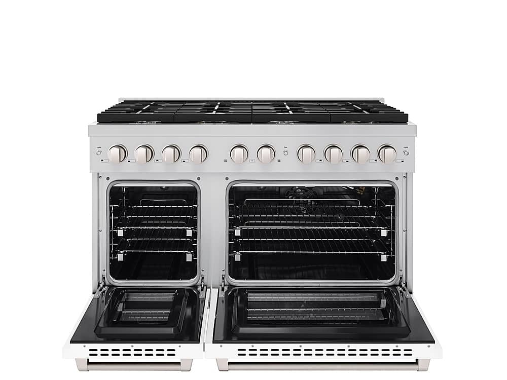 Luxury isn’t meant to be desired - it’s meant to be attainable. The ZLINE 48 in. 6.7 cu. ft. Paramount Double Oven Gas Range with 8 Burner Cooktop in Stainless Steel with White Matte Doors (SGR-WM-48) features a versatile gas cooktop with 8 Italian-made auto-reignition burners, a large high-performing gas convection oven, a small baking oven, enhanced cast iron grates, and beautiful white matte doors with Horizon window designs allowing you to master every meal. With a modern, timeless style and refined functionality, ZLINE Paramount Gas Ranges are masterfully crafted to deliver an elevated culinary experience.
