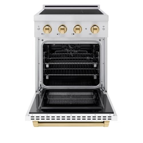 Luxury isn’t meant to be left desired—it’s meant to be attainable. The ZLINE Autograph Edition 24 in. 3.2 cu. ft. Paramount Induction Range with 3 Element Cooktop and Electric Convection Oven in Stainless Steel with White Matte Door and Polished Gold Accents (SINRZ-WM-24-G) combines the versatility of a nanotechnology-reinforced anti-scratch cooktop with anti-glare coating, an electric convection oven with digital thermostat technology, and a Horizon oven door window design allowing you to master every meal. With a modern, timeless style and refined functionality, ZLINE Paramount Induction Ranges are masterfully crafted to deliver an elevated culinary experience.