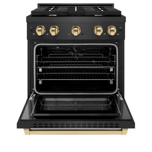 Luxury isn’t meant to be left desired—it’s meant to be attainable. The ZLINE Autograph Edition 30 in. 4.2 cu. ft. Paramount Dual Fuel Range with 4 Burner Gas Cooktop and Electric Convection Oven in Black Satin Stainless Steel with Polished Gold Accents (SDRBSZ-30-G) combines the versatility of a gas cooktop with 4 Italian-made auto-reignition burners, an electric convection oven with digital thermostat technology, enhanced cast iron grates, a Horizon oven door window design, and elegant polished gold knobs and handle allowing you to master every meal. With a modern, timeless style and refined functionality, ZLINE Paramount Dual Fuel Ranges are masterfully crafted to deliver an elevated culinary experience.