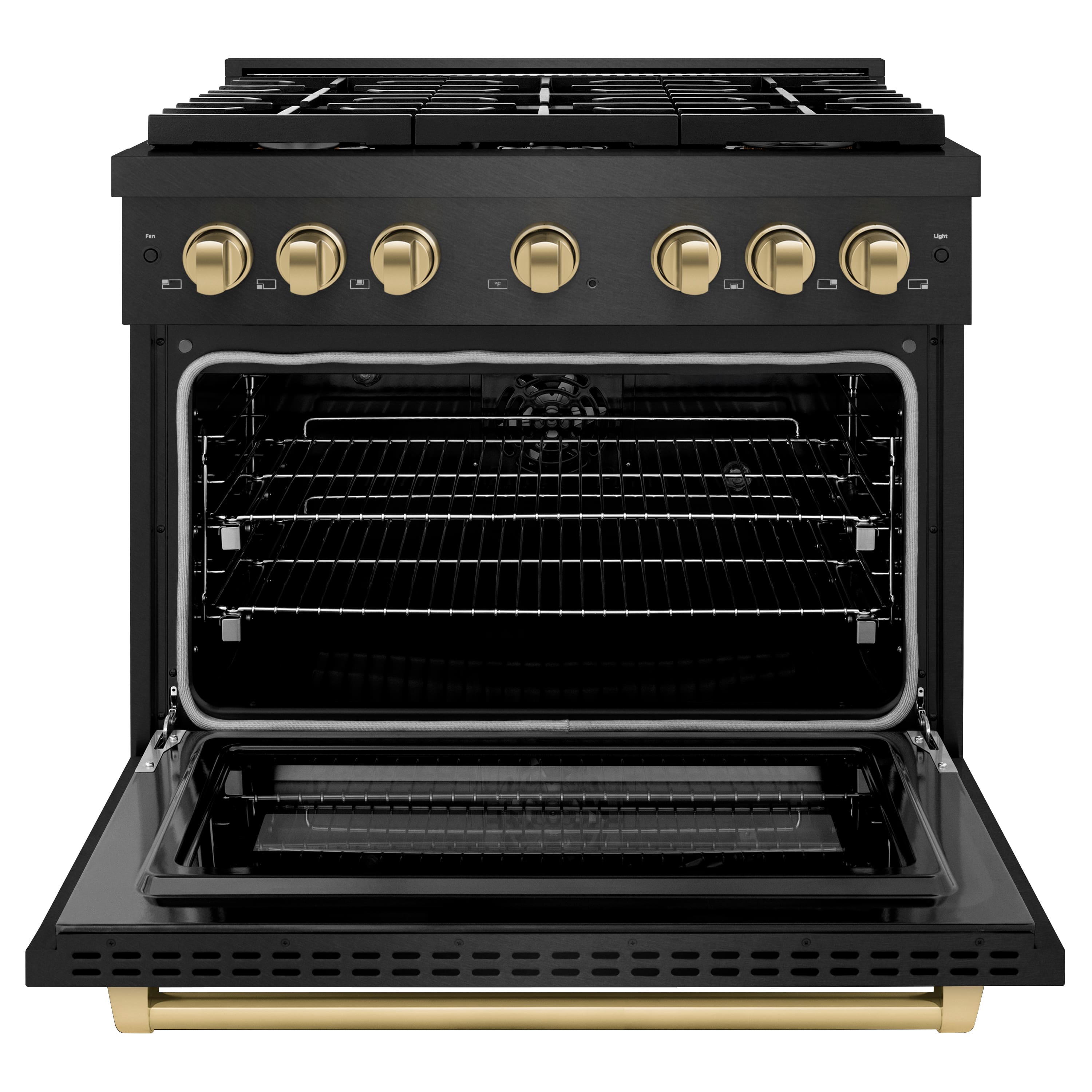 Luxury isn’t meant to be left desired—it’s meant to be attainable. The ZLINE Autograph Edition 36 in. 5.2 cu. ft. Paramount Dual Fuel Range with 6 Burner Gas Cooktop and Electric Convection Oven in Black Satin Stainless Steel with Champagne Bronze Accents (SDRBSZ-36-CB) combines the versatility of a gas cooktop with 6 Italian-made auto-reignition burners, an electric convection oven with digital thermostat technology, enhanced cast iron grates, a Horizon oven door window design, and elegant champagne bronze knobs and handle allowing you to master every meal. With a modern, timeless style and refined functionality, ZLINE Paramount Dual Fuel Ranges are masterfully crafted to deliver an elevated culinary experience.