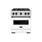 Luxury isn’t meant to be left desired — it’s meant to be attainable. The ZLINE Autograph Edition 30 in. 4.2 cu. ft. Classic Gas Range with 4 Burner Cooktop and Convection Gas Oven in Satin Stainless Steel with White Matte Door and Matte Black Accents (CGRSZ-WM-30-MB) combines the elegance of a hand-finished porcelain gas cooktop with 4 Italian-made auto-reignition burners, a gas convection oven with an energy-efficient cooling fan to ensure quiet operation, a beautiful white matte door with a Landscape window design, and stunning matte black knobs and handle allowing you to master every meal. With a modern, timeless style and refined functionality, ZLINE Classic Gas Ranges are masterfully crafted to deliver an elevated culinary experience.