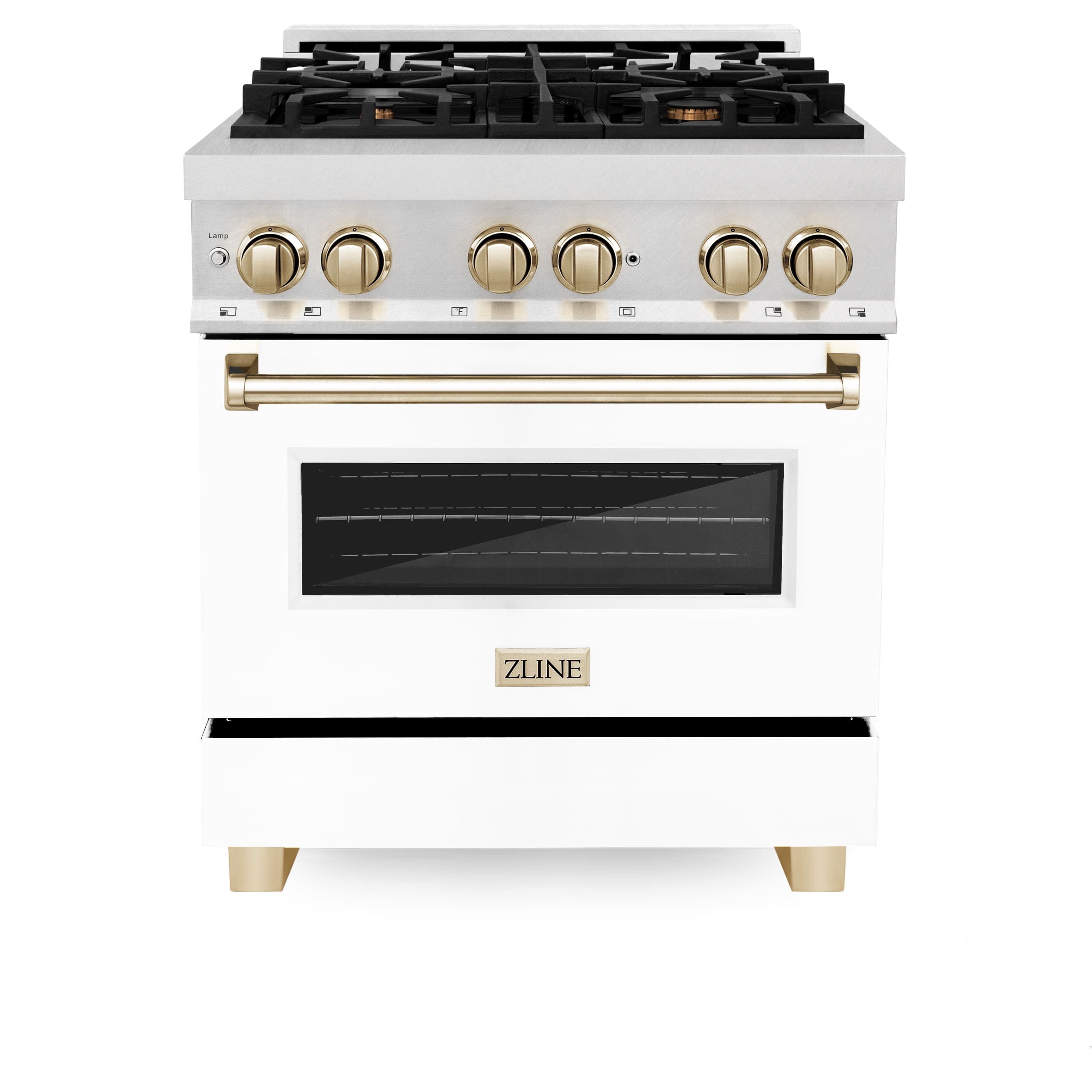 ZLINE - Autograph 30 in. Legacy Dual Fuel Range in Satin Steel w/ White & Gold Accents (RASZ-WM-30-G) - Stainless Steel