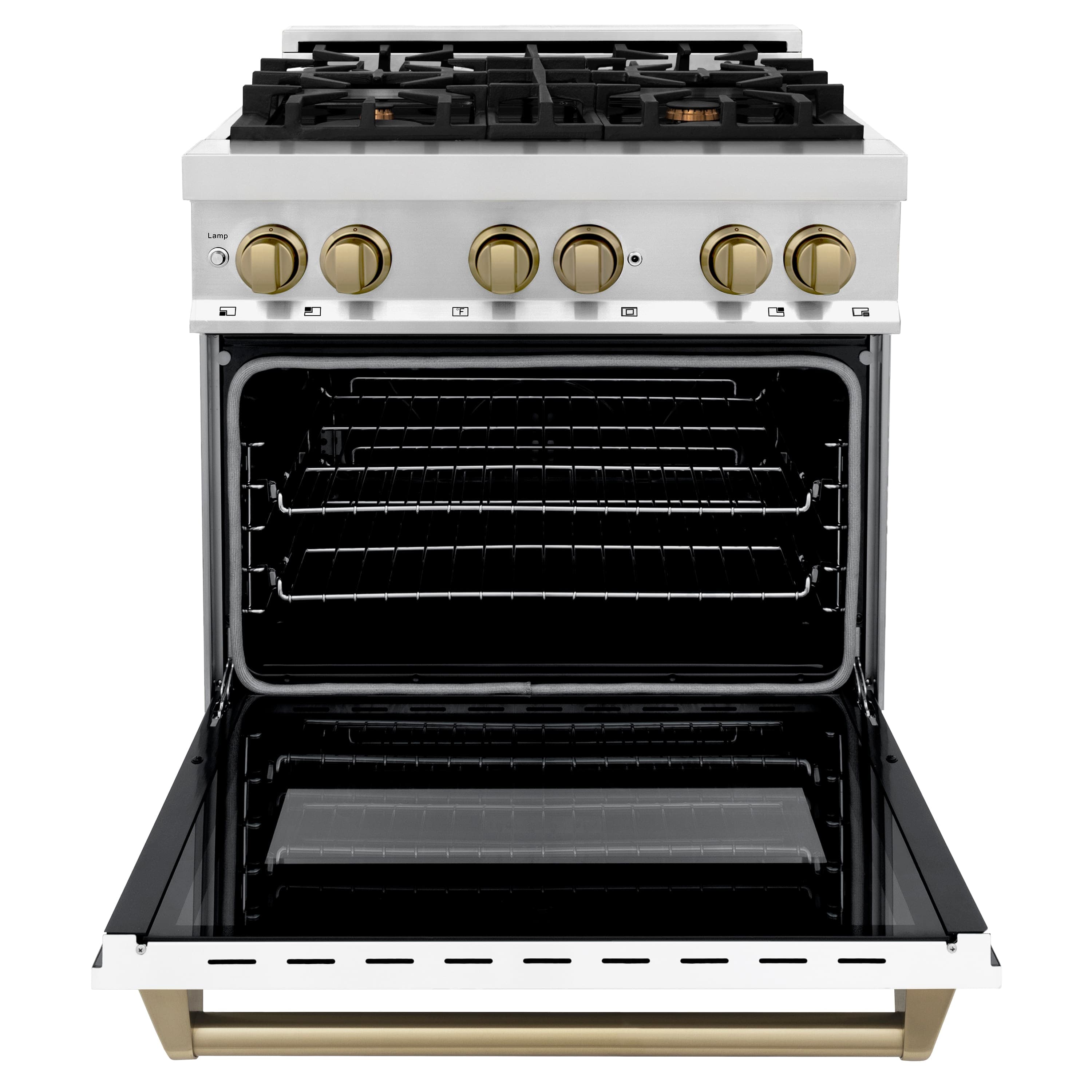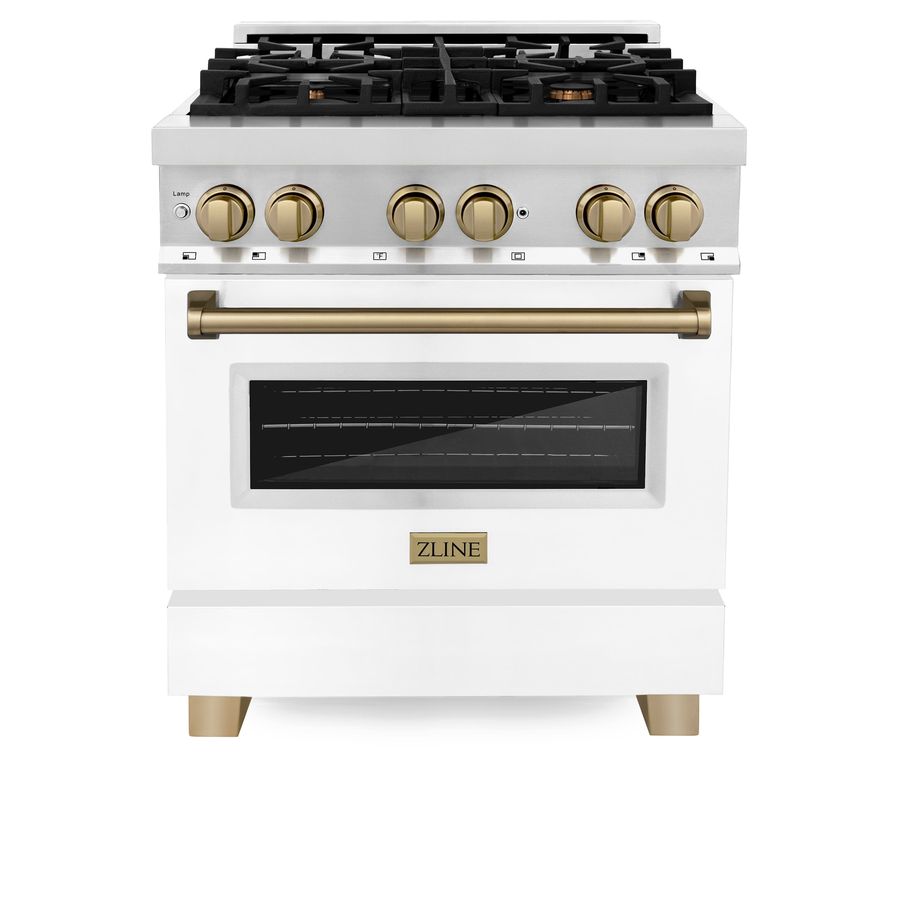 Luxury isn’t meant to be desired - it’s meant to be attainable. The ZLINE Autograph Edition 30 in. 4.0 cu. ft. Legacy Dual Fuel Range with 4 Burner Gas Cooktop and Electric Convection Oven in Stainless Steel with White Matte Door and Champagne Bronze Accents (RAZ-WM-30-CB) pairs a powerful gas cooktop with 4 Italian-crafted burners, an electric convection oven, a beautiful white matte door with a Landscape window design, and elegant champagne bronze knobs and handle. With innovative features designed to enhance your kitchen’s capability, ZLINE Legacy Dual Fuel Ranges provide a professional culinary experience by pairing unmatched performance with timeless style.