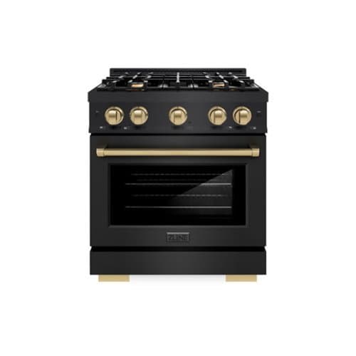 Luxury isn’t meant to be desired - it’s meant to be attainable. The ZLINE Autograph Edition 30 in. 4.2 cu. ft. Select Dual Fuel Range with 4 Burner Gas Cooktop and Electric Convection Oven in Black Stainless Steel with Champagne Bronze Accents (HDRBZ-30-CB) combines the elegance of a hand-finished porcelain gas cooktop with 4 Italian-made auto-reignition burners, an electric convection oven with an energy-efficient cooling fan to ensure quiet operation, a Horizon oven door window design, and stunning champagne bronze knobs and handle allowing you to master every meal. With a modern, timeless style and refined functionality, ZLINE Select Dual Fuel Ranges are masterfully crafted to deliver an elevated culinary experience.