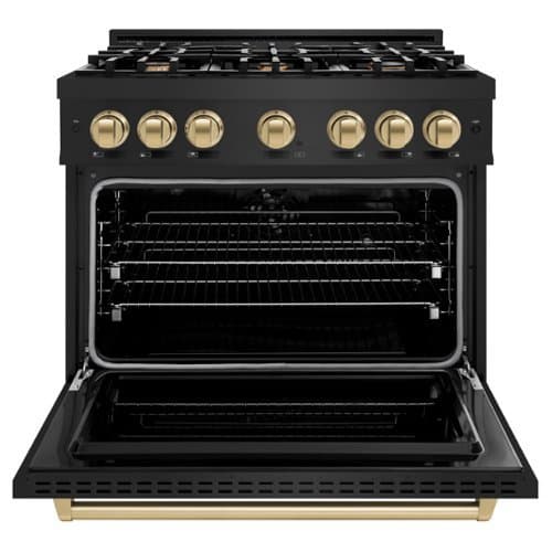 Luxury isn’t meant to be desired - it’s meant to be attainable. The ZLINE Autograph Edition 36 in. 5.2 cu. ft. Classic Dual Fuel Range with 6 Burner Gas Cooktop and Electric Convection Oven in Black Stainless Steel with Champagne Bronze Accents (CDRBZ-36-CB) combines the elegance of a hand-finished porcelain gas cooktop with 6 Italian-made auto-reignition burners, an electric convection oven with an energy-efficient cooling fan to ensure quiet operation, a Landscape oven door window design, and stunning champagne bronze knobs and handle allowing you to master every meal. With a modern, timeless style and refined functionality, ZLINE Classic Dual Fuel Ranges are masterfully crafted to deliver an elevated culinary experience.