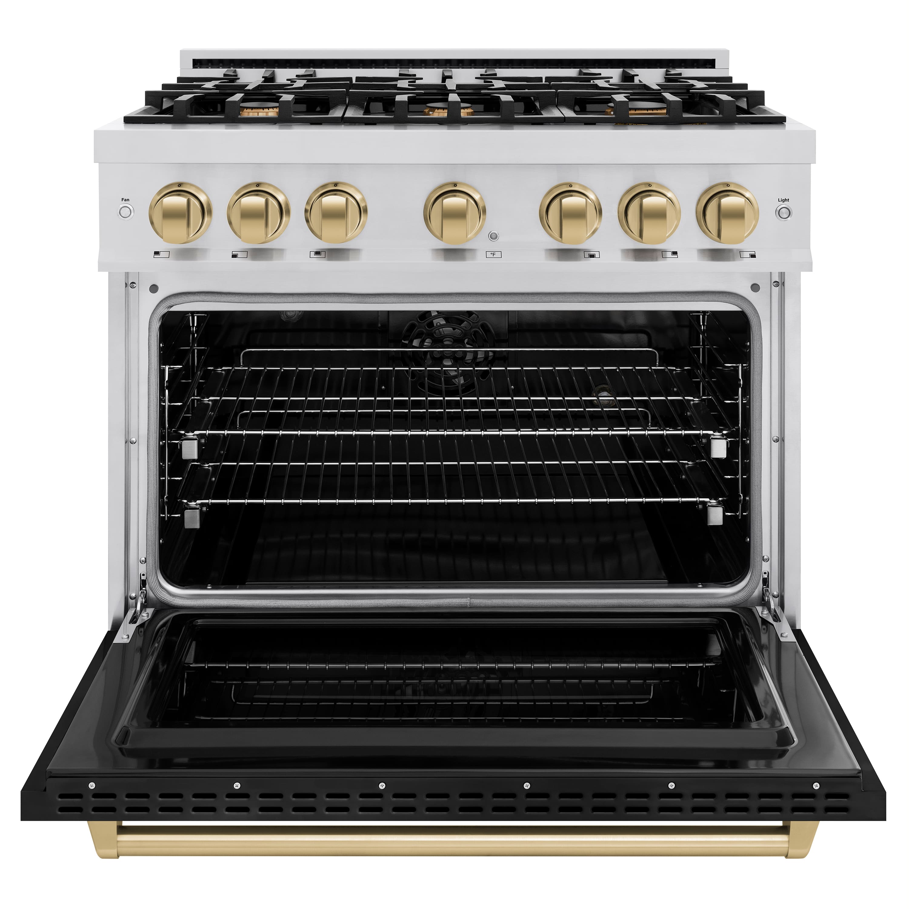 Luxury isn’t meant to be desired - it’s meant to be attainable. The ZLINE Autograph Edition 36 in. 5.2 cu. ft. Classic Dual Fuel Range with 6 Burner Gas Cooktop and Electric Convection Oven in Stainless Steel with Black Matte Door and Champagne Bronze Accents (CDRZ-BLM-36-CB) combines the elegance of a hand-finished porcelain gas cooktop with 6 Italian-made auto-reignition burners, an electric convection oven with an energy-efficient cooling fan to ensure quiet operation, a beautiful black matte door with a Landscape window design, and stunning champagne bronze knobs and handle allowing you to master every meal. With a modern, timeless style and refined functionality, ZLINE Classic Dual Fuel Ranges are masterfully crafted to deliver an elevated culinary experience.