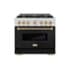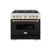 Luxury isn’t meant to be desired - it’s meant to be attainable. The ZLINE Autograph Edition 36 in. 5.2 cu. ft. Classic Dual Fuel Range with 6 Burner Gas Cooktop and Electric Convection Oven in Stainless Steel with Black Matte Door and Polished Gold Accents (CDRZ-BLM-36-G) combines the elegance of a hand-finished porcelain gas cooktop with 6 Italian-made auto-reignition burners, an electric convection oven with an energy-efficient cooling fan to ensure quiet operation, a beautiful black matte door with a Landscape window design, and stunning polished gold knobs and handle allowing you to master every meal. With a modern, timeless style and refined functionality, ZLINE Classic Dual Fuel Ranges are masterfully crafted to deliver an elevated culinary experience.