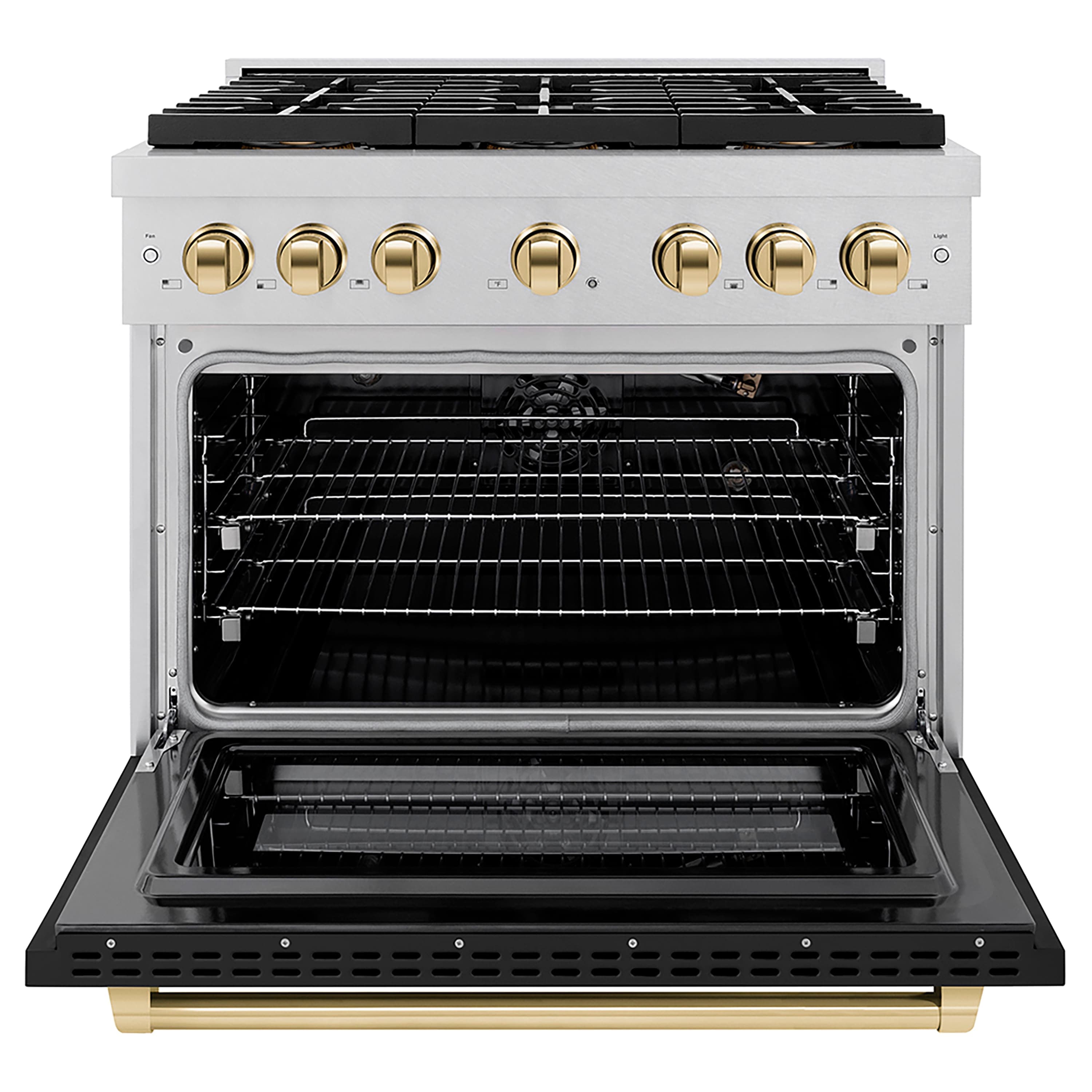 ZLINE - Autograph 36 in. 5.2 cu. ft. Freestanding Paramount Gas DuoPro Range in Satin Steel with Black Door and Gold Accents - Black Matte