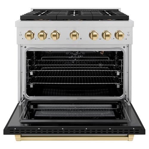 Luxury isn’t meant to be left desired—it’s meant to be attainable. The ZLINE Autograph Edition 36 in. 5.2 cu. ft. Paramount Gas Range with 6 Burner DuoPro™ Cooktop and Convection Gas Oven in Satin Stainless Steel with Black Matte Door and Polished Gold Accents (PSGRSZ-BLM36-G) features a high-powered gas cooktop with 6 hand-crafted Italian dual-ring brass burners and a versatile gas convection oven allowing you to master every meal. With ZLINE DuoPro™, every burner brings the performance you need—wherever you need it.