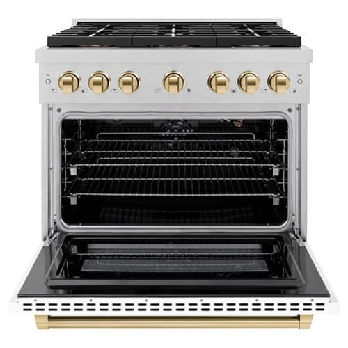 Luxury isn’t meant to be left desired—it’s meant to be attainable. The ZLINE Autograph Edition 36 in. 5.2 cu. ft. Paramount Gas Range with 6 Burner DuoPro™ Cooktop and Convection Gas Oven in Satin Stainless Steel with White Matte Door and Polished Gold Accents (PSGRSZ-WM-36-G) features a high-powered gas cooktop with 6 hand-crafted Italian dual-ring brass burners and a versatile gas convection oven allowing you to master every meal. With ZLINE DuoPro™, every burner brings the performance you need—wherever you need it.