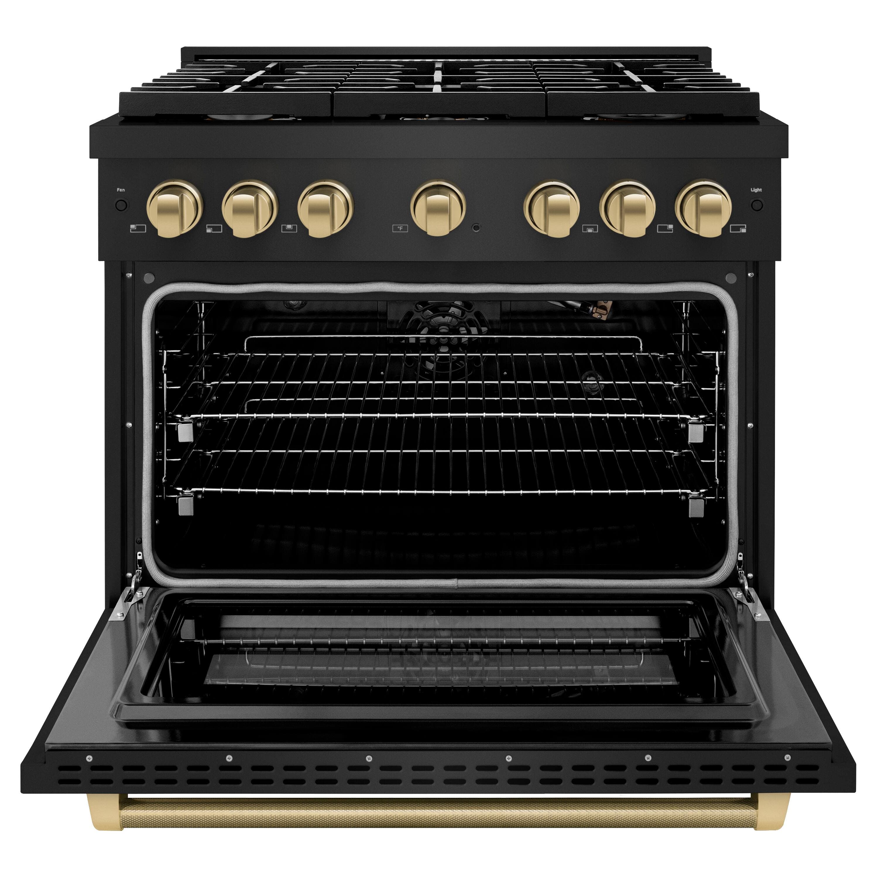 Luxury isn’t meant to be left desired—it’s meant to be attainable. The ZLINE Autograph Edition 36 in. 5.2 cu. ft. Paramount Gas Range with 6 Burner Cooktop and Convection Gas Oven in Black Stainless Steel with Champagne Bronze Helix Handle and Knob Accents (SGRBZ-36-KCB) features a versatile gas cooktop with 6 Italian-made auto-reignition burners, a high-performing gas convection oven, enhanced cast iron grates, and a Horizon oven door window design allowing you to master every meal. With a modern, timeless style and refined functionality, ZLINE Paramount Gas Ranges are masterfully crafted to deliver an elevated culinary experience.