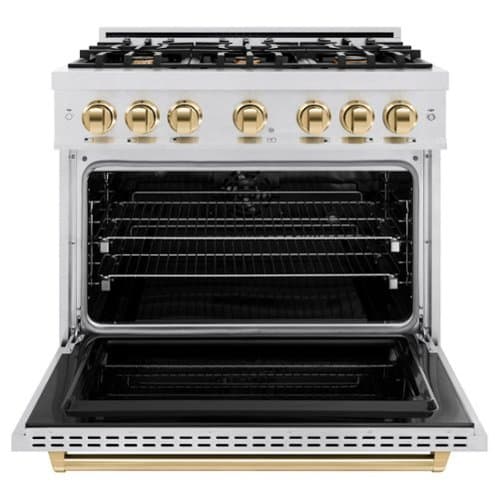 Luxury isn’t meant to be left desired — it’s meant to be attainable. The ZLINE Autograph Edition 36 in. 5.2 cu. ft. Classic Dual Fuel Range with 6 Burner Gas Cooktop and Electric Convection Oven in Satin Stainless Steel with Polished Gold Accents (CDRSZ-36-G) combines the elegance of a hand-finished porcelain gas cooktop with 6 Italian-made auto-reignition burners, an electric convection oven with an energy-efficient cooling fan to ensure quiet operation, a Landscape oven door window design, and stunning polished gold knobs and handle allowing you to master every meal. With a modern, timeless style and refined functionality, ZLINE Classic Dual Fuel Ranges are masterfully crafted to deliver an elevated culinary experience.