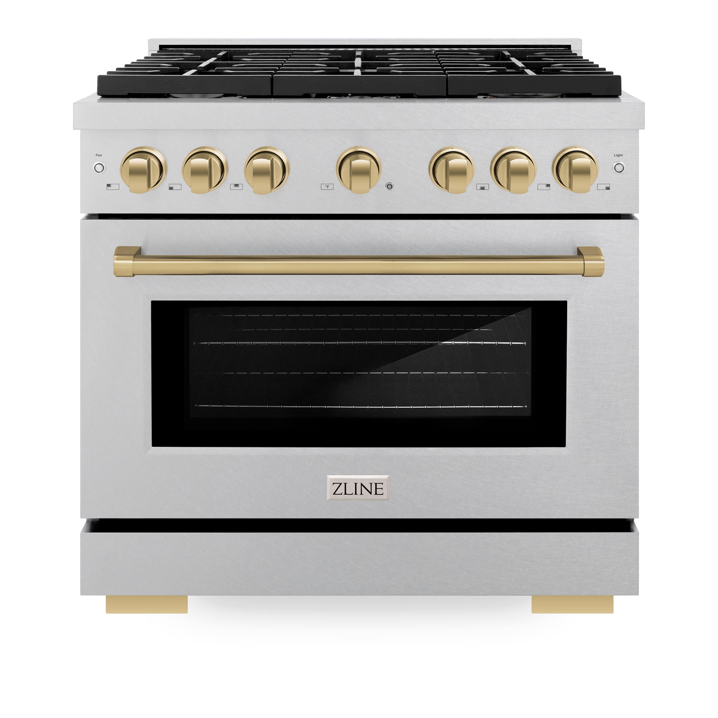 Luxury isn’t meant to be left desired — it’s meant to be attainable. The ZLINE Autograph Edition 36 in. 5.2 cu. ft. Paramount Gas Range with 6 Burner Cooktop and Convection Gas Oven in Satin Stainless Steel and Champagne Bronze Accents (SGRSZ-36-CB) features a versatile gas cooktop with 6 Italian-made auto-reignition burners, a high-performing gas convection oven, enhanced cast iron grates, a Horizon oven door window design, and elegant champagne bronze knobs and handle allowing you to master every meal. With a modern, timeless style and refined functionality, ZLINE Paramount Gas Ranges are masterfully crafted to deliver an elevated culinary experience.
