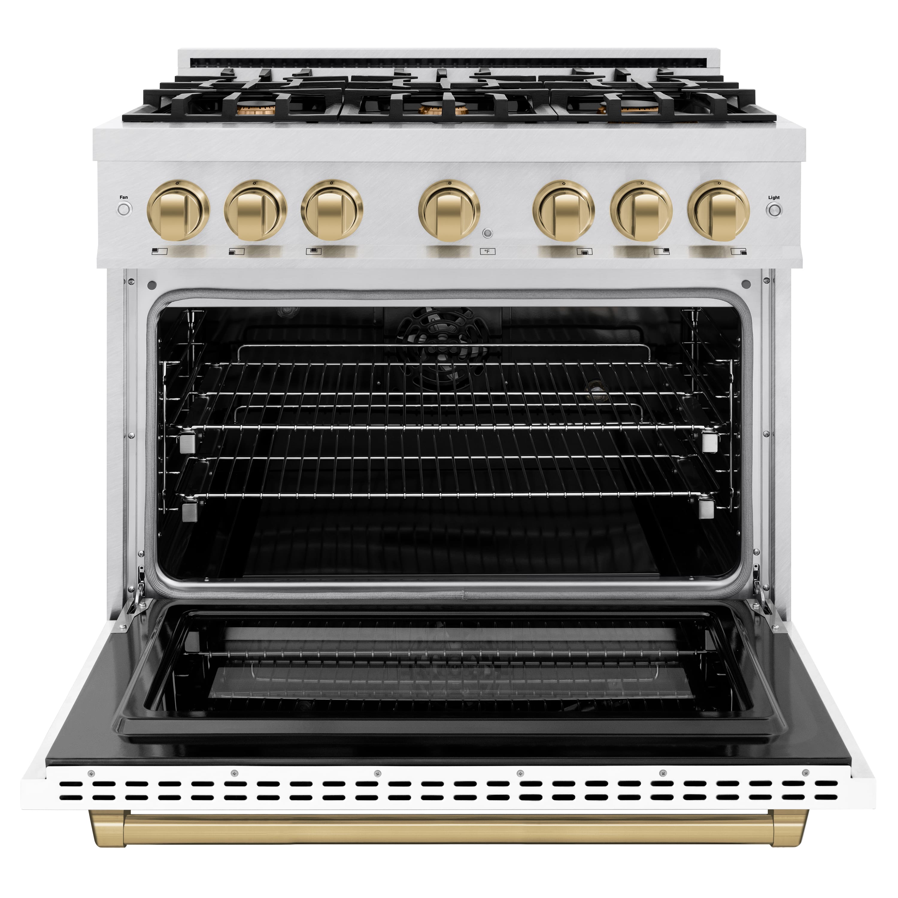 Luxury isn’t meant to be desired - it’s meant to be attainable. The ZLINE Autograph Edition 36 in. 5.2 cu. ft. Select Dual Fuel Range with 6 Burner Gas Cooktop and Electric Convection Oven in DuraSnow Stainless Steel with White Matte Door and Champagne Bronze Accents (HDRSZ-WM-36-CB) combines the elegance of a hand-finished porcelain gas cooktop with 6 Italian-made auto-reignition burners, an electric convection oven with an energy-efficient cooling fan to ensure quiet operation, a beautiful white matte door with a Horizon window design, and stunning champagne bronze knobs and handle allowing you to master every meal. With a modern, timeless style and refined functionality, ZLINE Select Dual Fuel Ranges are masterfully crafted to deliver an elevated culinary experience.