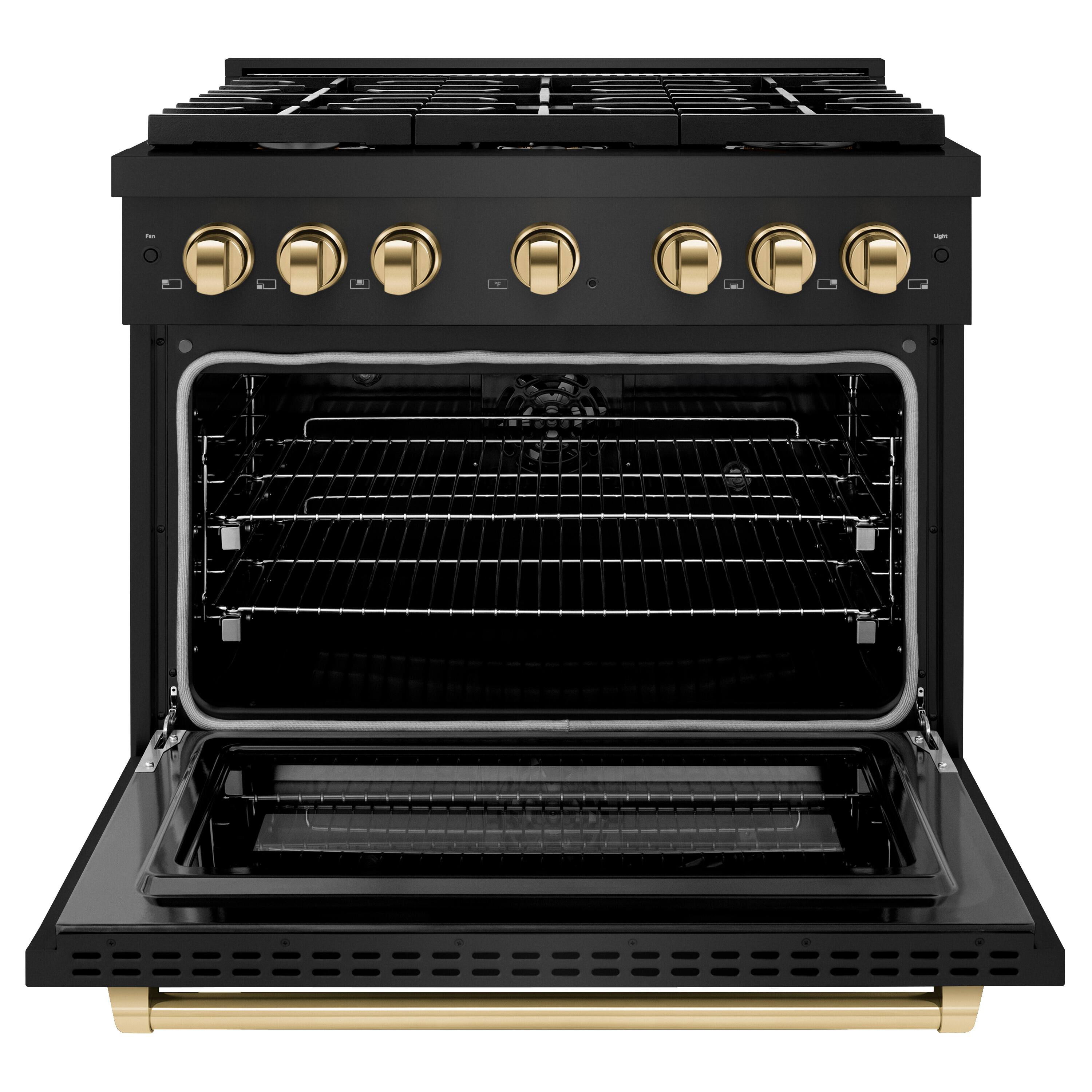 Luxury isn’t meant to be desired - it’s meant to be attainable. The ZLINE Autograph Edition 36 in. 5.2 cu. ft. Paramount Dual Fuel Range with 6 Burner Gas Cooktop and Electric Convection Oven in Black Stainless Steel with Polished Gold Accents (SDRBZ-36-G) combines the versatility of a gas cooktop with 6 Italian-made auto-reignition burners, an electric convection oven with digital thermostat technology, enhanced cast iron grates, a Horizon oven door window design, and elegant polished gold knobs and handle allowing you to master every meal. With a modern, timeless style and refined functionality, ZLINE Paramount Dual Fuel Ranges are masterfully crafted to deliver an elevated culinary experience.