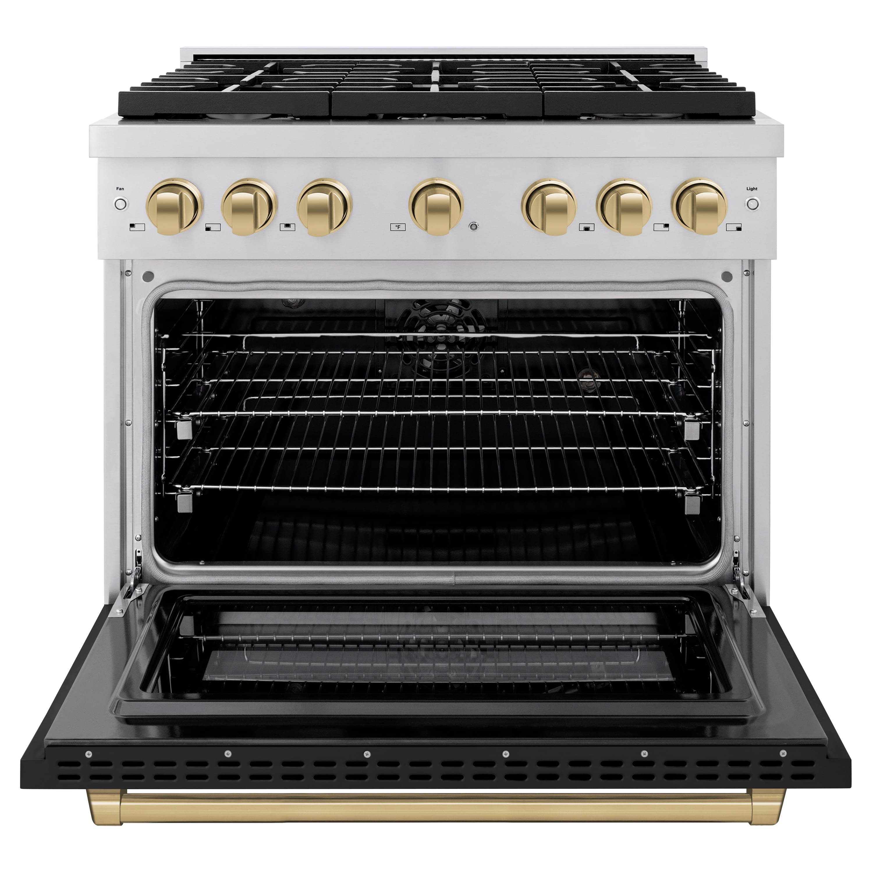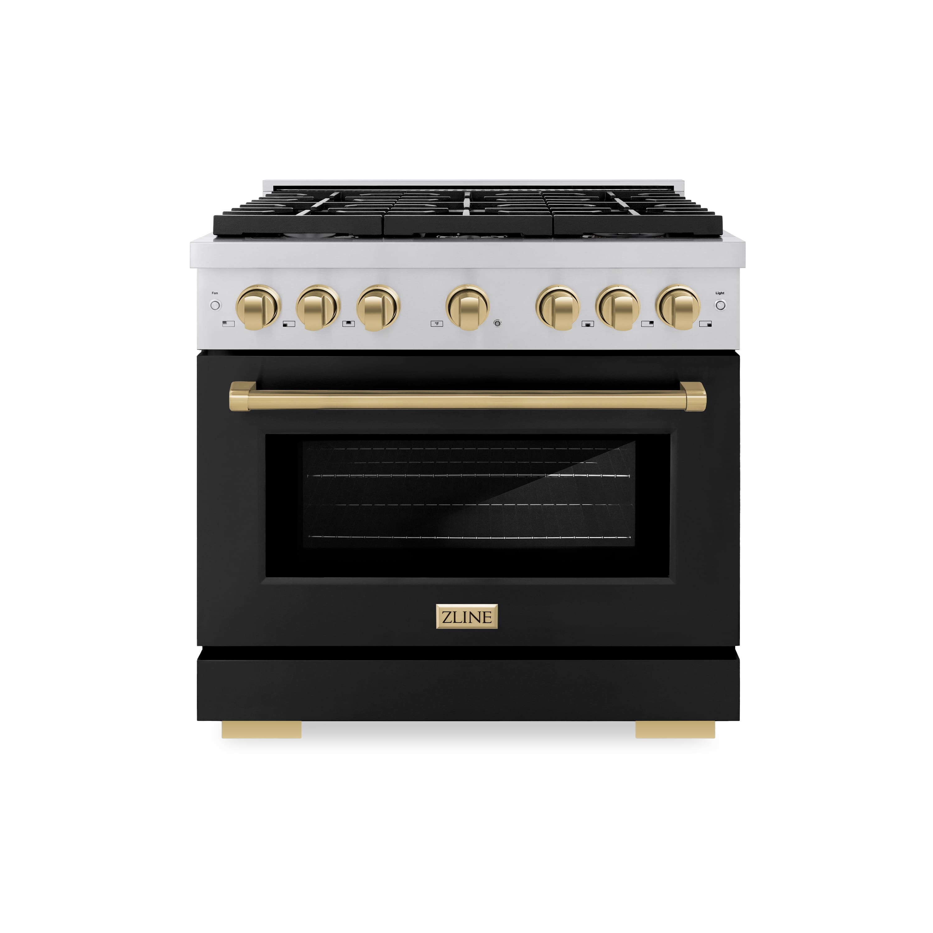 Luxury isn’t meant to be desired - it’s meant to be attainable. The ZLINE Autograph Edition 36 in. 5.2 cu. ft. Paramount Dual Fuel Range with 6 Burner Gas Cooktop and Electric Convection Oven in Stainless Steel with Black Matte Door and Champagne Bronze Accents (SDRZ-BLM-36-CB) combines the versatility of a gas cooktop with 6 Italian-made auto-reignition burners, an electric convection oven with digital thermostat technology, enhanced cast iron grates, a beautiful black matte door with a Horizon window design, and elegant champagne bronze knobs and handle allowing you to master every meal. With a modern, timeless style and refined functionality, ZLINE Paramount Dual Fuel Ranges are masterfully crafted to deliver an elevated culinary experience.