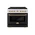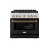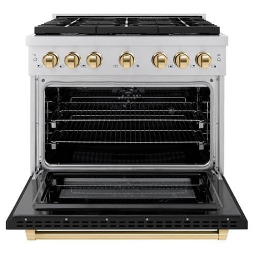 Luxury isn’t meant to be desired - it’s meant to be attainable. The ZLINE Autograph Edition 36 in. 5.2 cu. ft. Paramount Dual Fuel Range with 6 Burner Gas Cooktop and Electric Convection Oven in Stainless Steel with Black Matte Door and Polished Gold Accents (SDRZ-BLM-36-G) combines the versatility of a gas cooktop with 6 Italian-made auto-reignition burners, an electric convection oven with digital thermostat technology, enhanced cast iron grates, a beautiful black matte door with a Horizon window design, and elegant polished gold knobs and handle allowing you to master every meal. With a modern, timeless style and refined functionality, ZLINE Paramount Dual Fuel Ranges are masterfully crafted to deliver an elevated culinary experience.