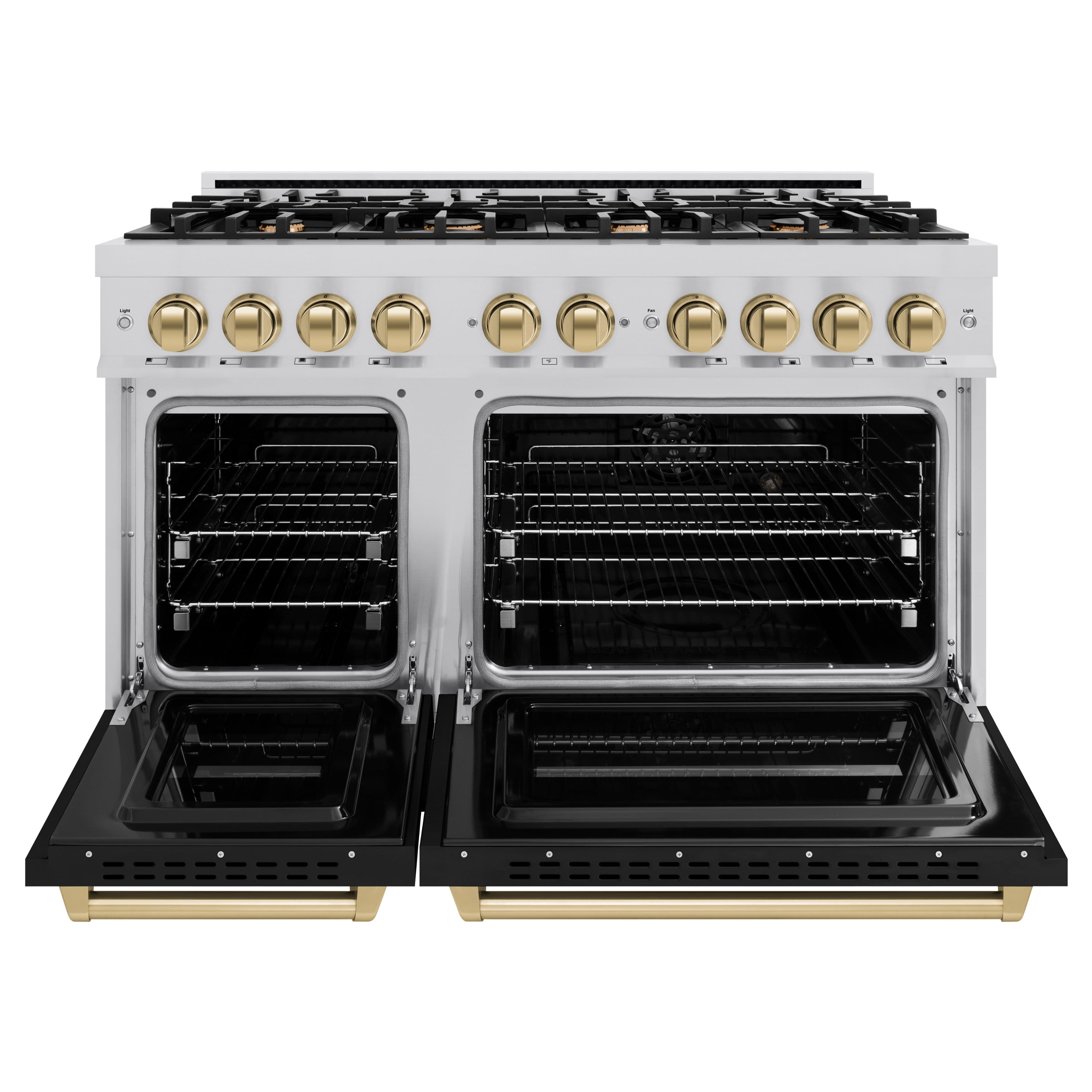Luxury isn’t meant to be left desired—it’s meant to be attainable. The ZLINE Autograph Edition 48 in. 6.7 cu. ft. Classic Double Oven Dual Fuel Range with 8 Burner Gas Cooktop in Stainless Steel with Black Matte Doors and Champagne Bronze Accents (CDRZ-BLM-48-CB) combines the elegance of a hand-finished porcelain gas cooktop with 8 Italian-made auto-reignition burners, a large electric convection oven with an energy-efficient cooling fan to ensure quiet operation, a small bake-and-broil oven, beautiful black matte doors with Landscape window designs, and stunning champagne bronze knobs and handles allowing you to master every meal. With a modern, timeless style and refined functionality, ZLINE Classic Dual Fuel Ranges are masterfully crafted to deliver an elevated culinary experience.